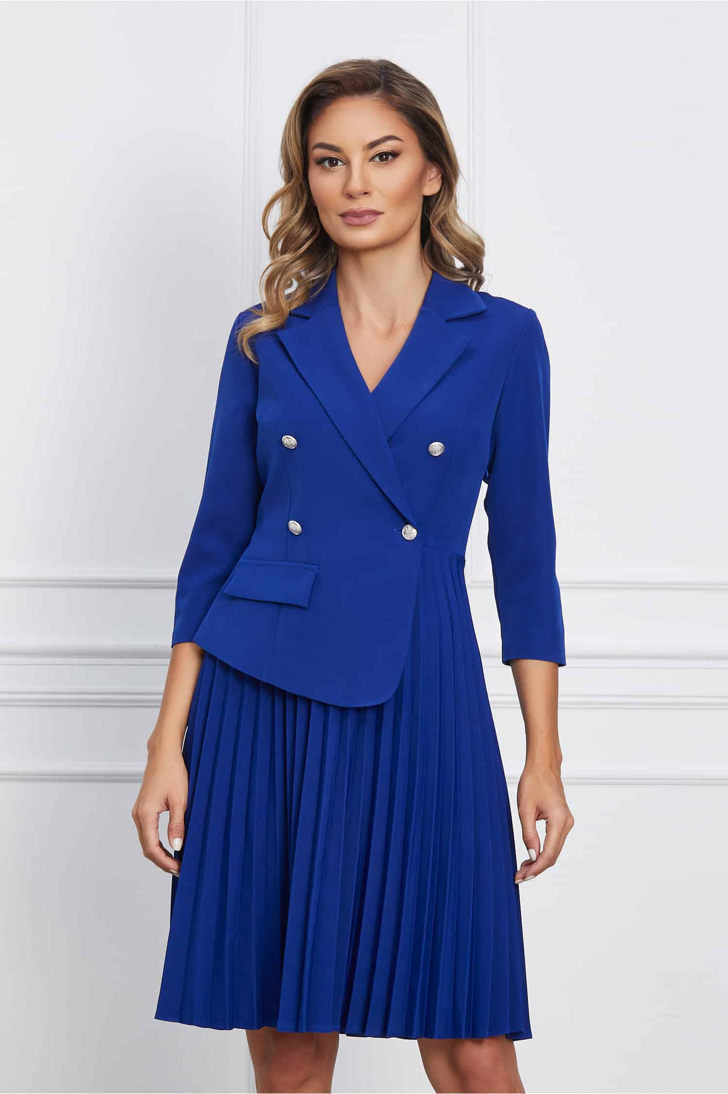 Specification: Rochie Jasmine albastra tip sacou cu pliuri pe fusta