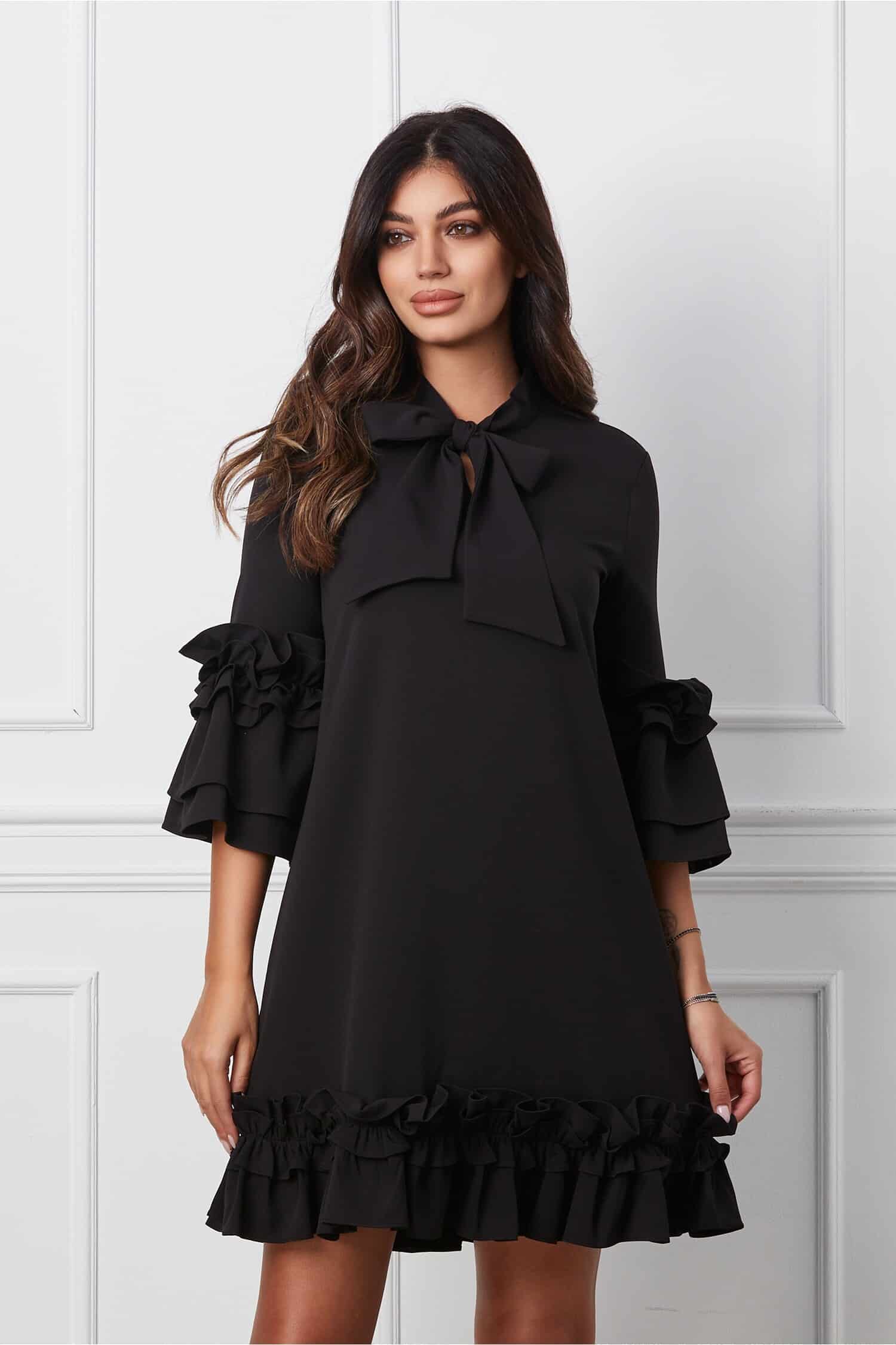 Rochie Kris neagra cu volane la baza si la maneci