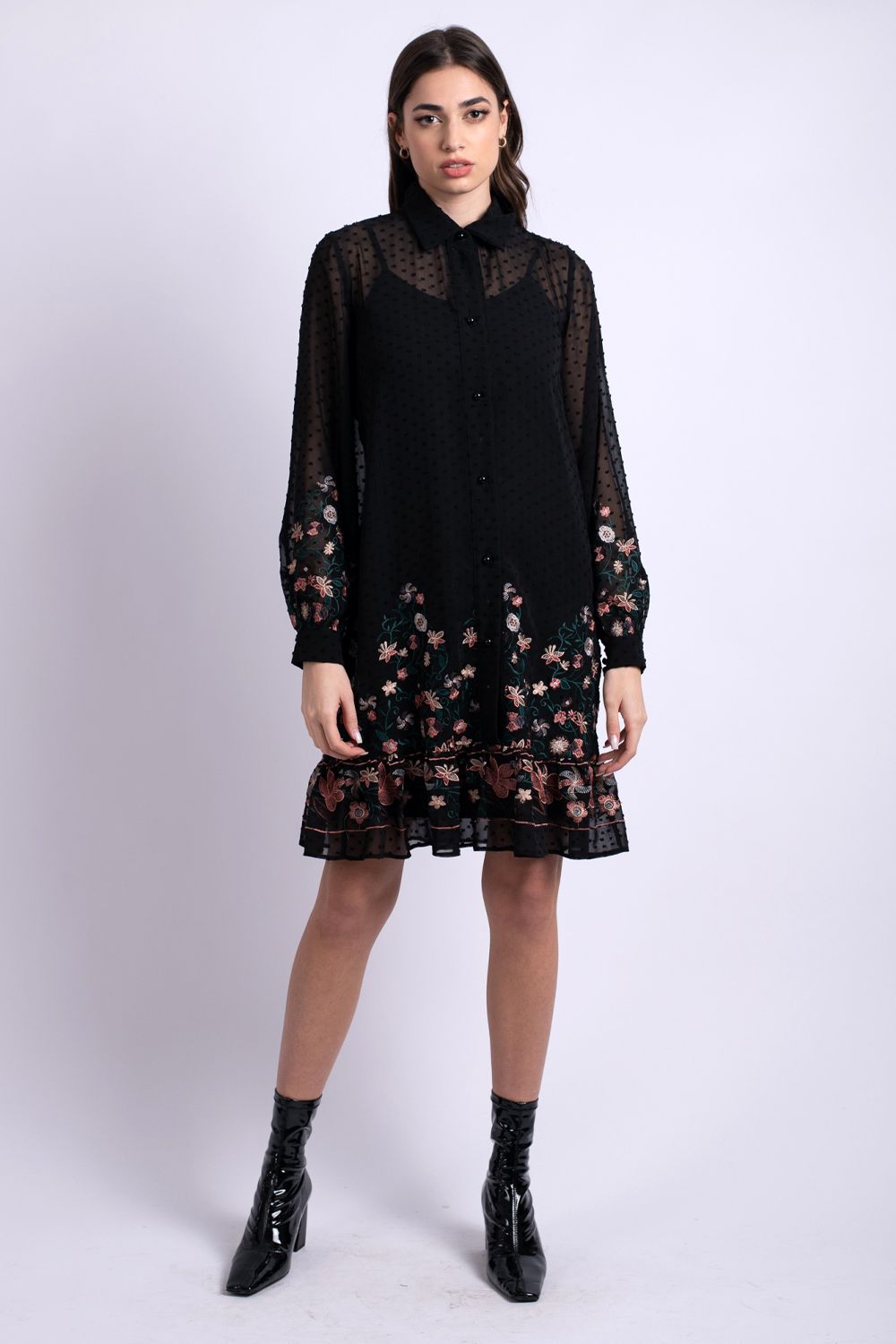 Rochie LaDonna eleganta confetionata din voalcu insertie buline negre in tesatura si broderie florala la baza si la terminatia manecii. Volan la baza inchidere cu nasturi in partea din fata croialata lejera in A. Oriunde o vei purta vei atrage priviri pline de admiratie.Produs romanescIntretinereRespectati instructiunile de curatare inscriptionate pe eticheta produsului.Info model:poarta marimea S inaltime 175 cm
