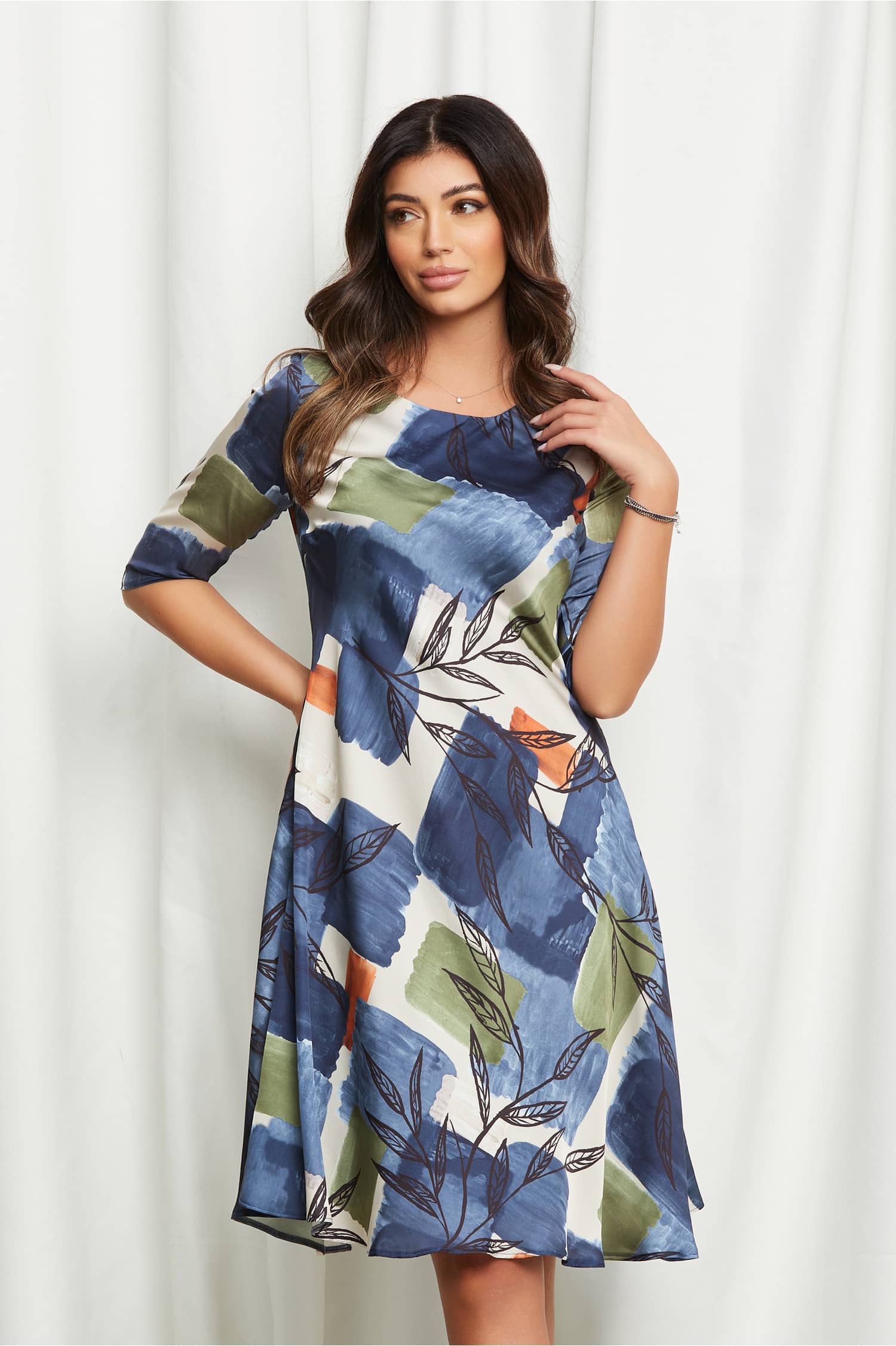 Specification: Rochie Lara bleumarin cu imprimeuri bej