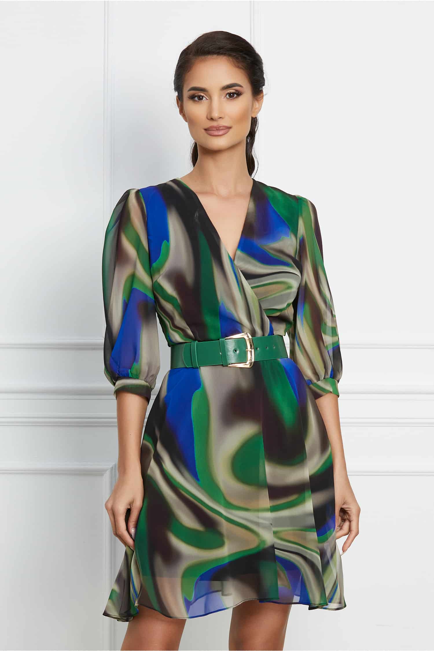 Specification: Rochie Lora verde cu imprimeu si curea in talie