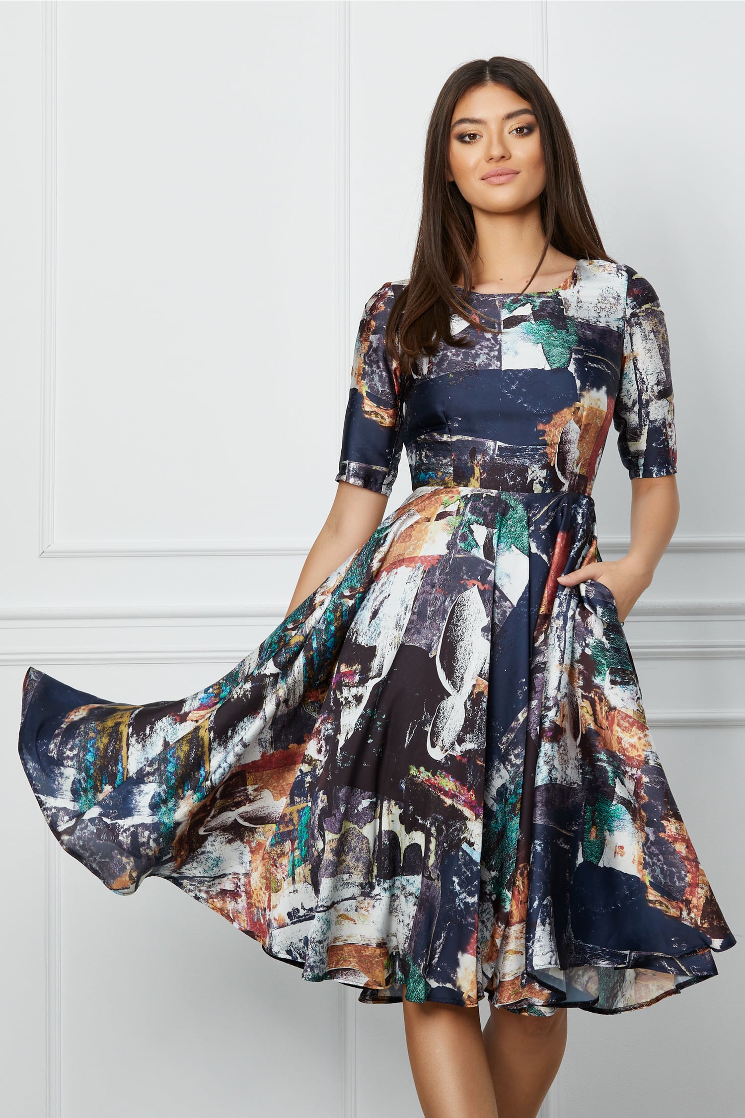 Rochie vaporoasa cu imprimeu. Are decolteu rotund la baza gatului, maneci trei sferturi si croi clos. Se inchide cu fermoar la spate.  Rochie de zi Imprimeu Decolteu la baza gatului Maneci trei sferturi Croi clos Buzunare functionale Captusita pe interior Inchidere cu fermoar la spate Material: Satin  Compozitie: 95% poliester, 5% elastan Instructiuni de intretinere:     *Va rugam verificati eticheta produsului inainte de curatare! *Pozitia tiparului imprimeului poate fi diferita datorita taierii. *Modelul are inaltimea de 174 cm. *Va rugam sa retineti ca o usoara discrepanta de culoare ar trebui sa fie acceptabila datorita luminii si luminozitatii ecranului.  *Va rugam verificati ghidul de marimi, in cm, pentru a alege corect marimea.