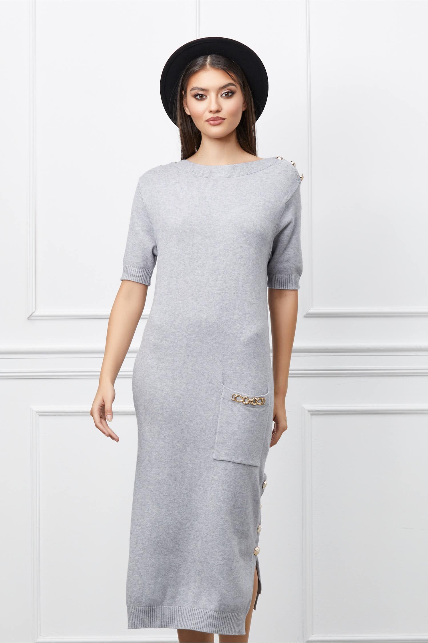 Rochie Mara gri din tricot cu nasturi si buzunar Transport Gratuit* la orice comanda! Retur in 14 zile! ! Transport si retur gratuite indifernet de valoarea comenzii!