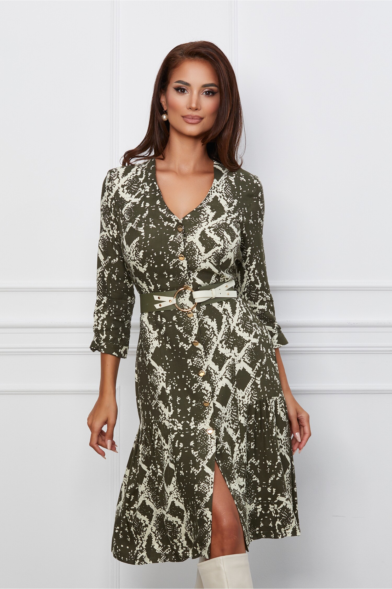 Rochie Mara kaki cu imprimeuri bej si curea in talie