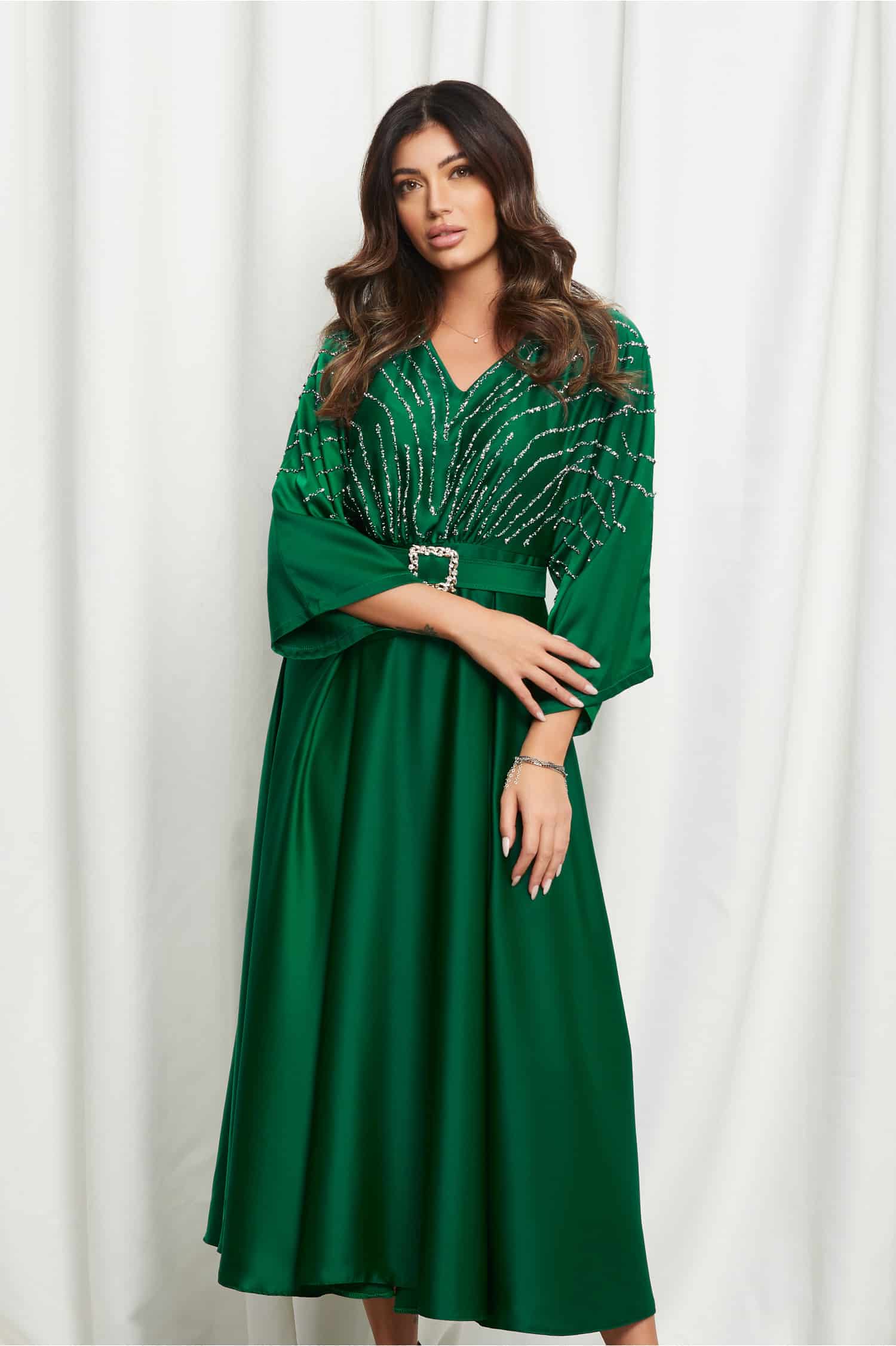 Specification: Rochie Mara verde cu strasuri pe bust si curea in talie