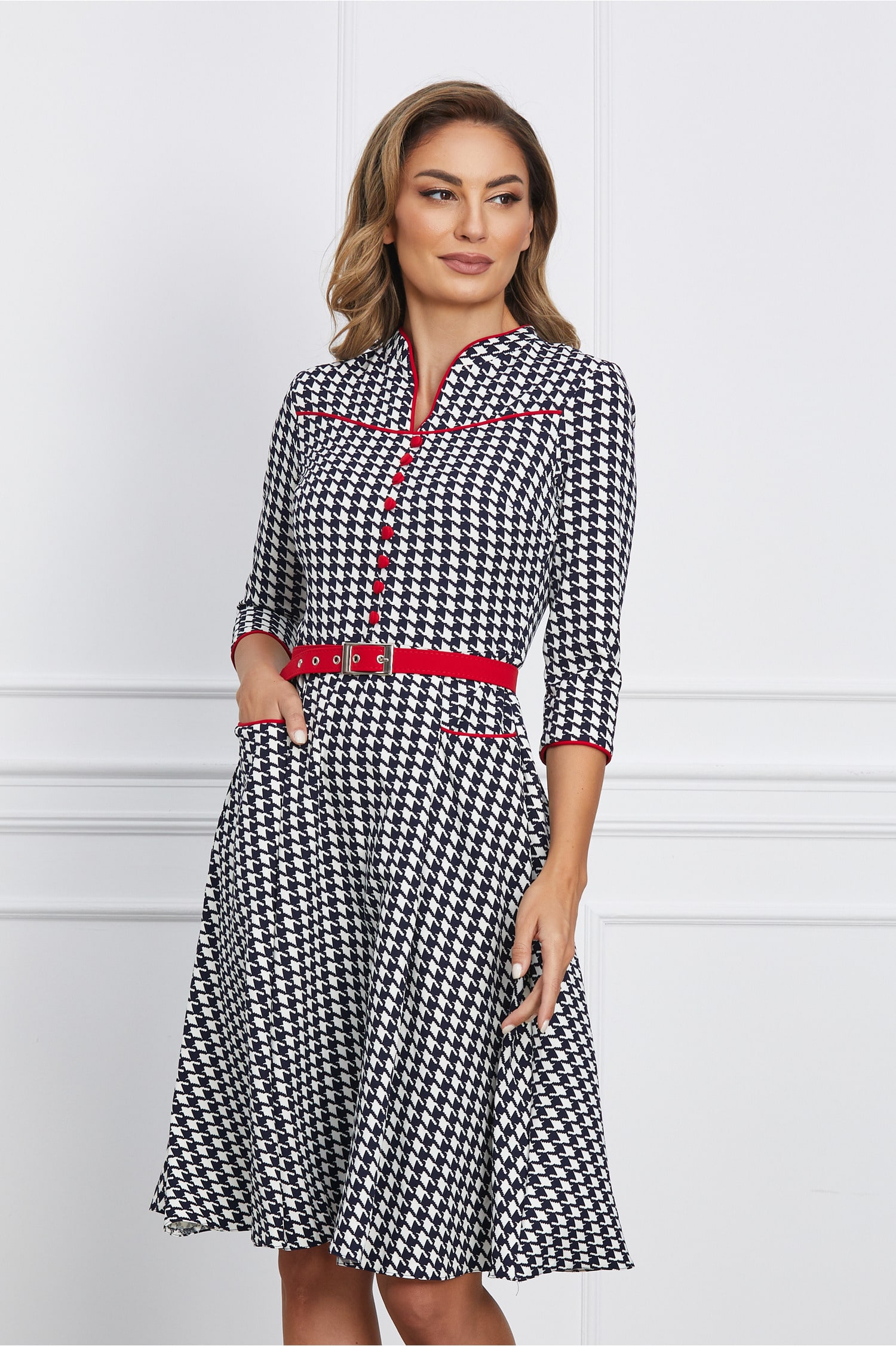 Specification: Rochie Maria cu imprimeu pepit bleumarin si curea rosie in talie