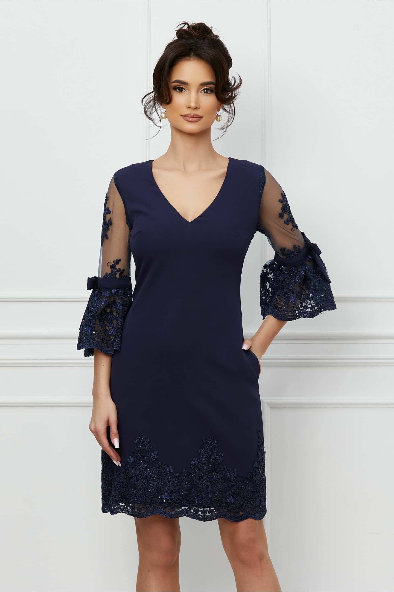 Rochie MBG bleumarin cu maneci din dantela evazate la baza ! Transport si retur gratuite indifernet de valoarea comenzii!
