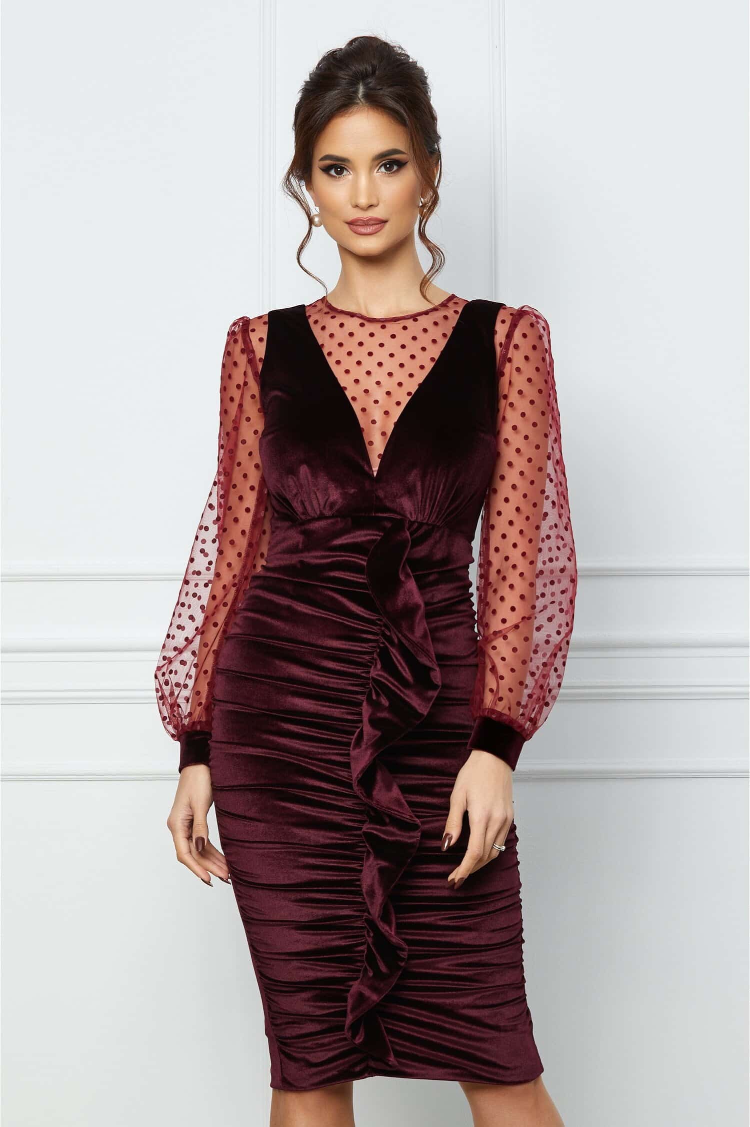 Specification: Rochie MBG bleumarin din catifea cu fronseu si volan pe fusta