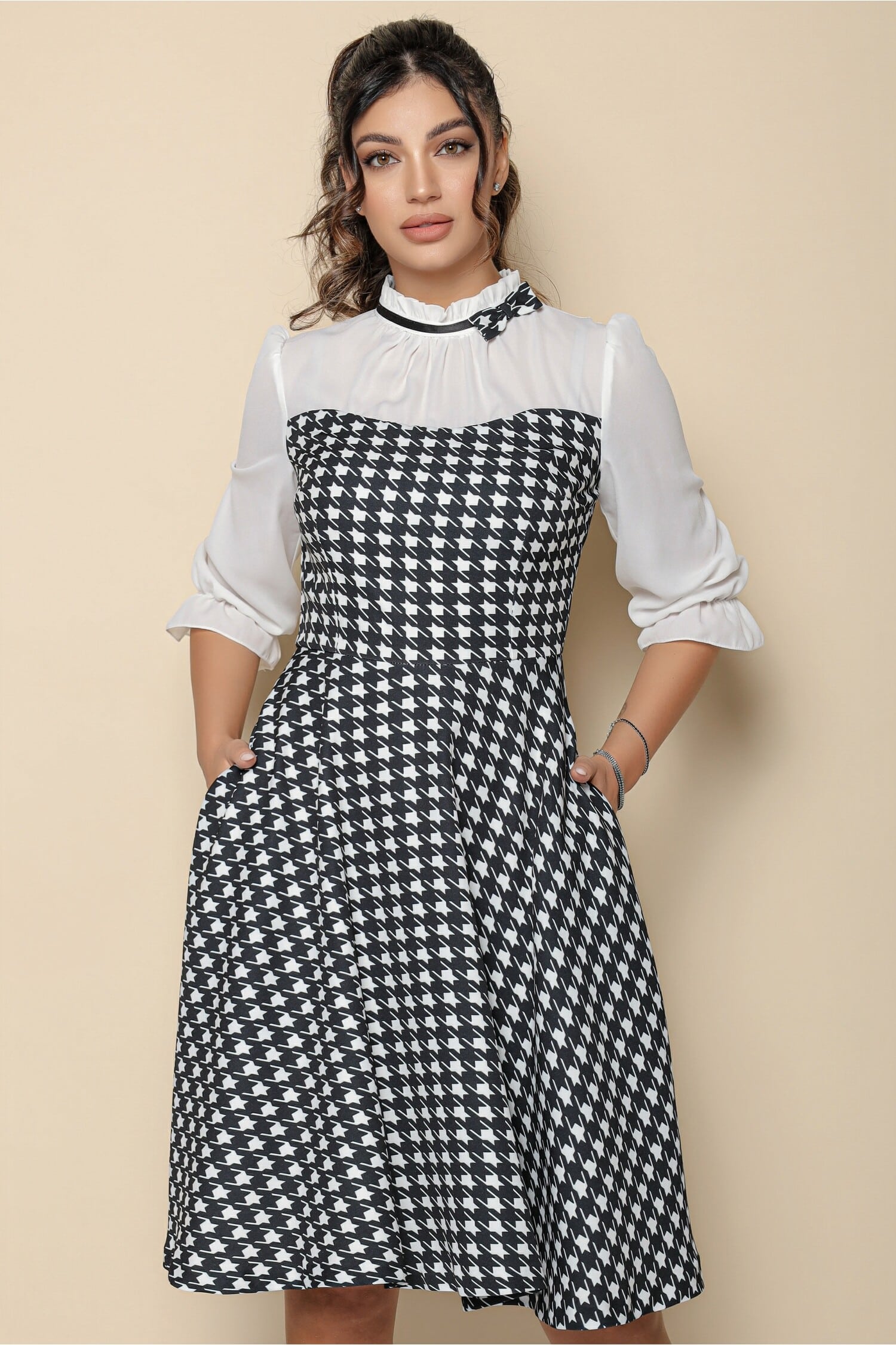 Rochie MBG cu imprimeu pepit si bust din voal alb ! Transport si retur gratuite indifernet de valoarea comenzii!