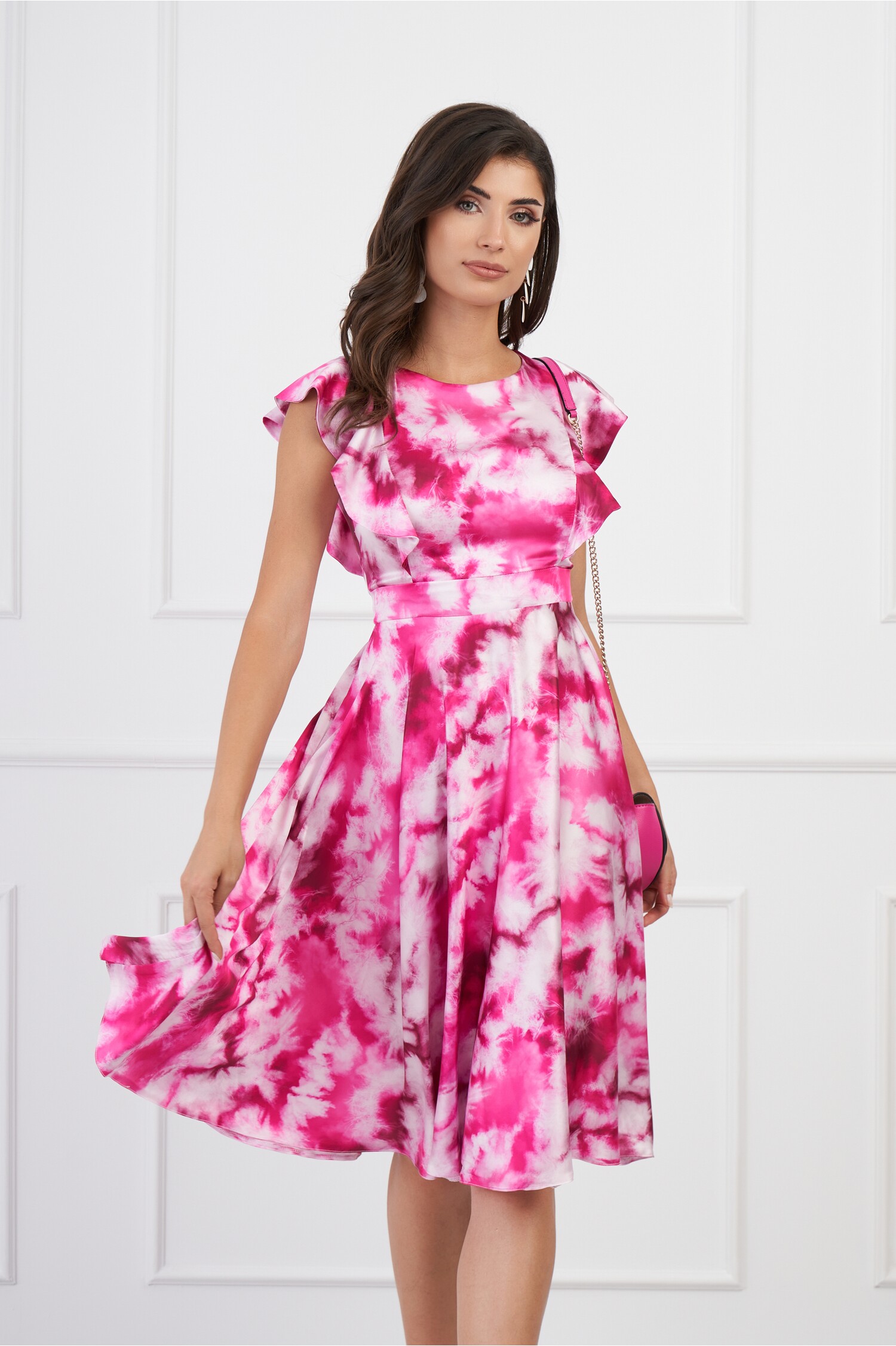 Rochie MBG fucsia cu imprimeu tie-dye si vonale pe bust