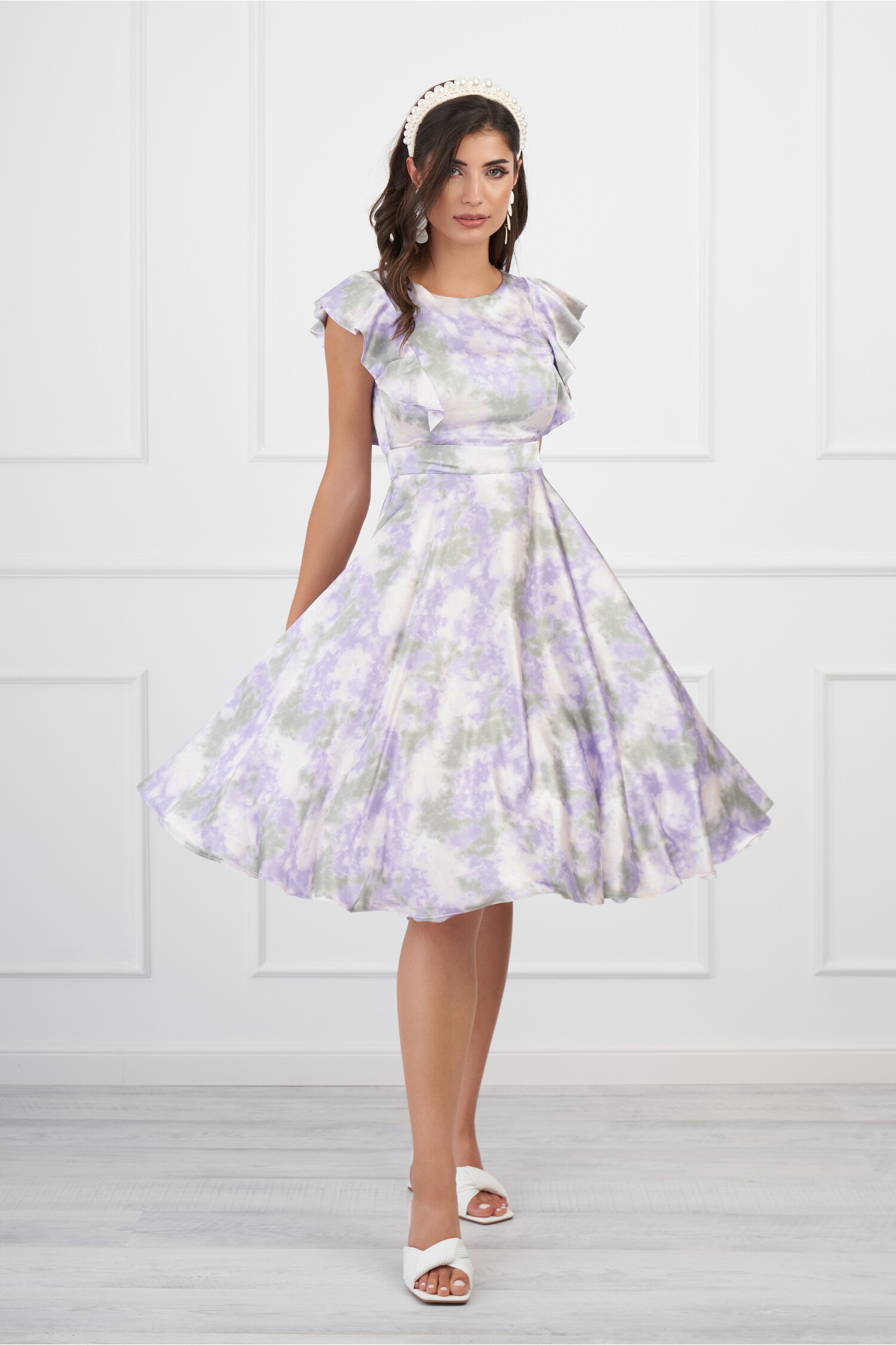 Rochie MBG lila cu imprimeu tie-dye verde si vonale pe bust
