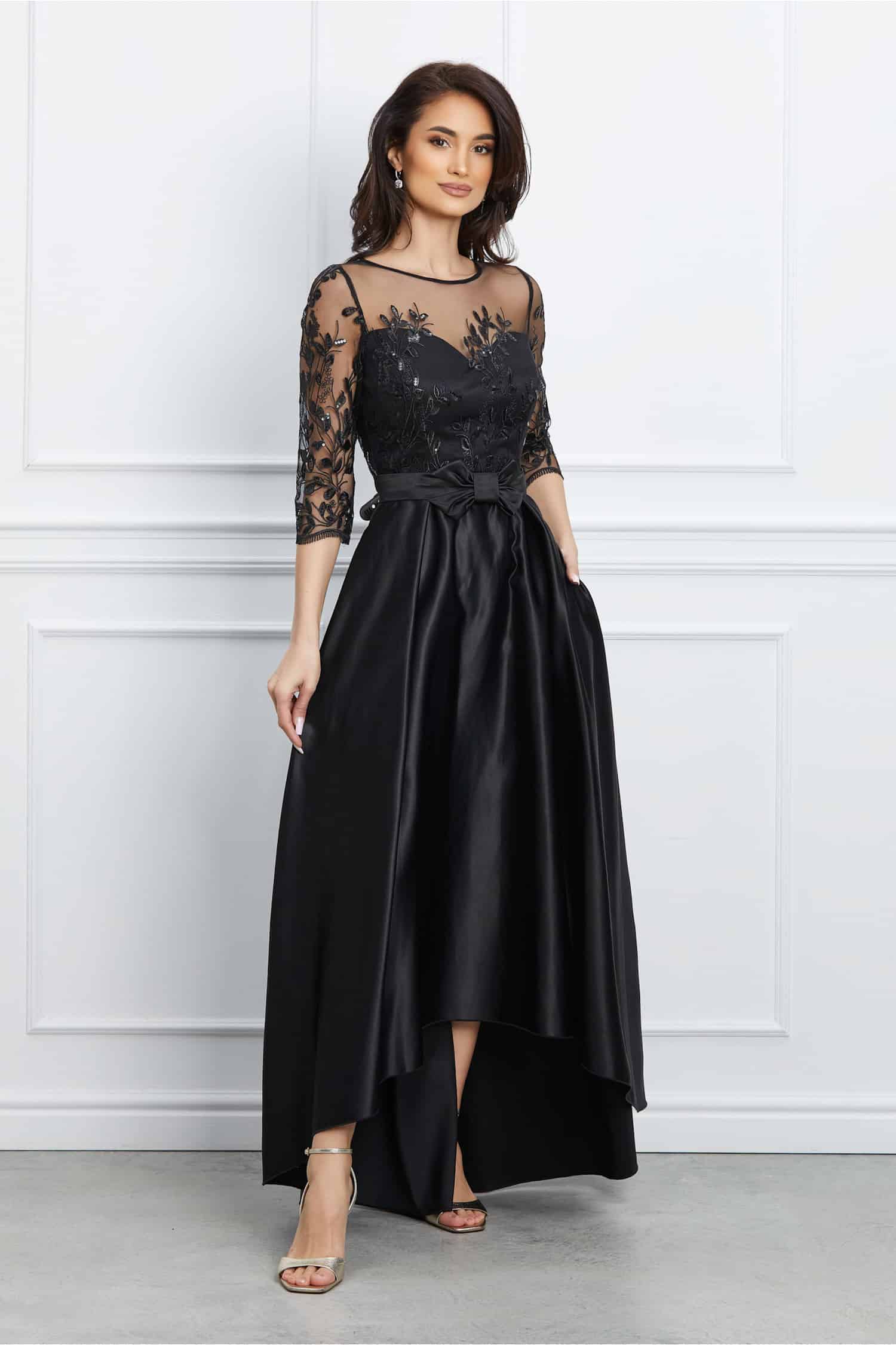 Rochie lunga eleganta cu dantela la bust si funda in talie. Are decolteu rotund, maneci trei sferturi, croi clos si lungime asimetrica.  Rochie lunga Decolteu rotund Maneci trei sferturi Croi clos Se inchide cu fermoar la spate Material: Tafta, dantela Compozitie: 95% Poliester, 5% Elastan Instructiuni de intretinere:          *Va rugam verificati eticheta produsului inainte de curatare! *Modelul are inaltimea de 174 cm. *Va rugam sa retineti ca o usoara discrepanta de culoare ar trebui sa fie acceptabila datorita luminii si luminozitatii ecranului.   *Va rugam verificati ghidul de marimi, in cm, pentru a alege corect marimea.