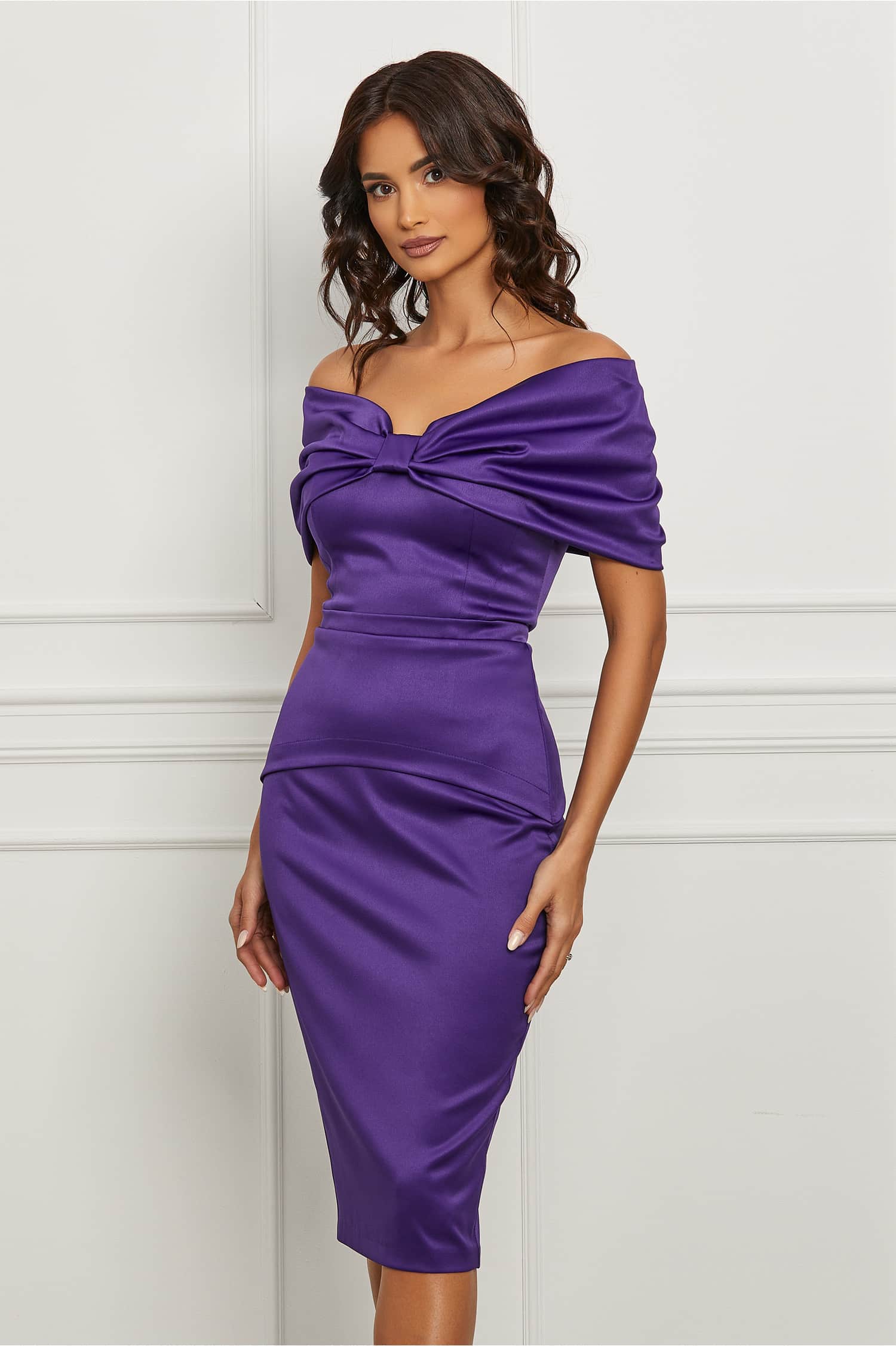 Rochie eleganta de ocazie cu funda maxi la bust. Are decolteu inima, umeri goi cu maneci scurte lasate si croi conic. Rochie eleganta Decolteu inima Maneci lasate pe umeri Croi conic Se inchide cu fermoar la spate Material: Satin Compozitie: 95% Poliester, 5% Elastan Instructiuni de intretinere:Â Â Â Â Â *Va rugam verificati eticheta produsului inainte de curatare! *Modelul are inaltimea de 174 cm. *Va rugam sa retineti ca o usoara discrepanta de culoare ar trebui sa fie acceptabila datorita luminii si luminozitatii ecranului. Â *Va rugam verificati ghidul de marimi, in cm, pentru a alege corect marimea.
