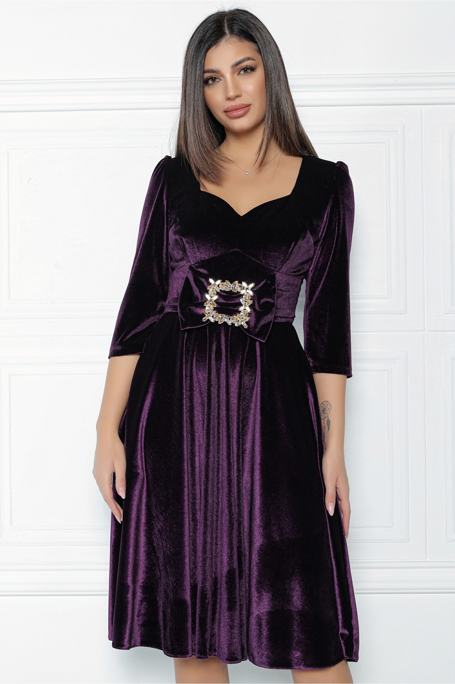 Rochie MBG mov din catifea cu funda si catarama in talie