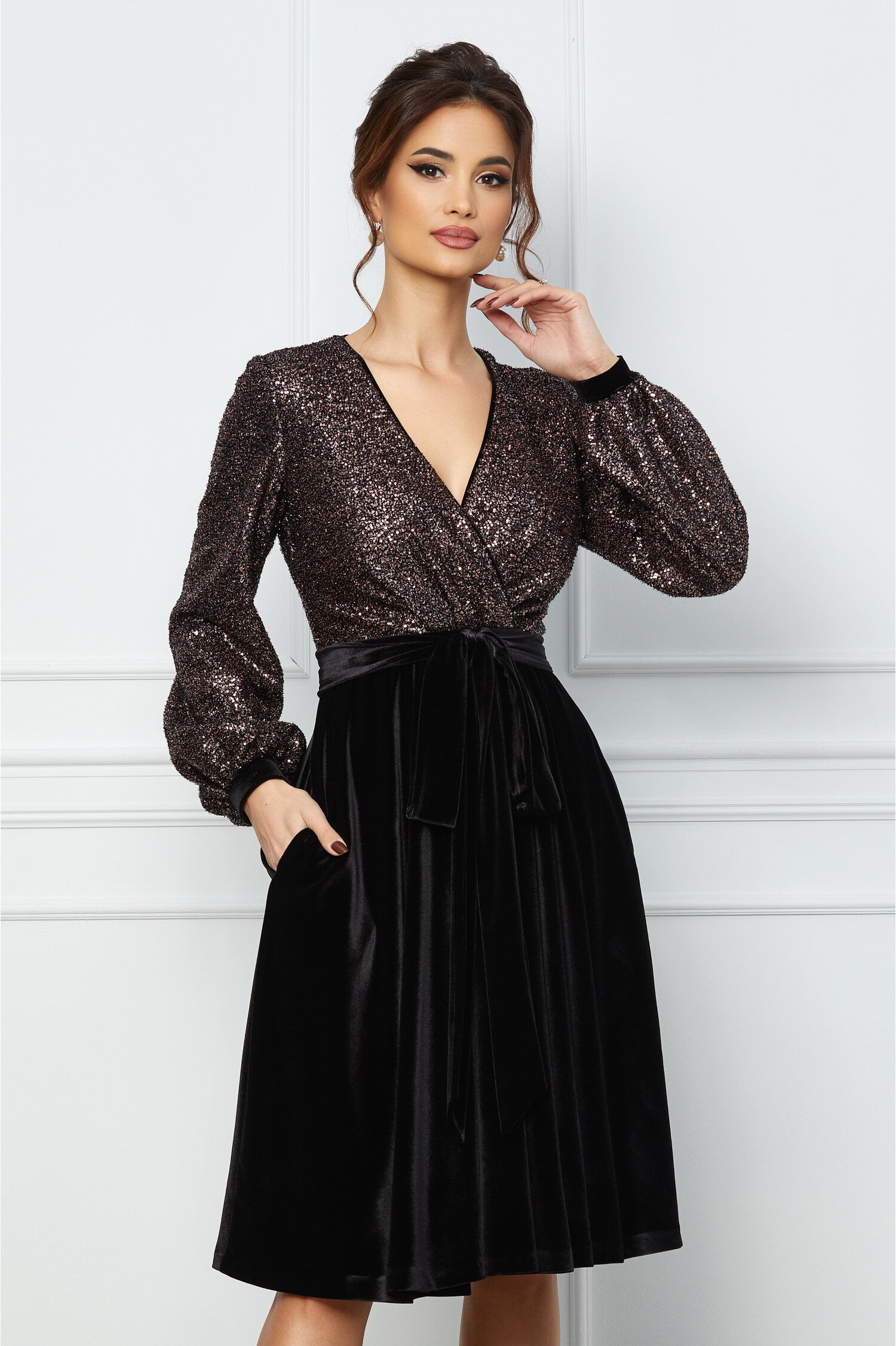 Rochie MBG mov din catifea cu paiete la baza si la maneci