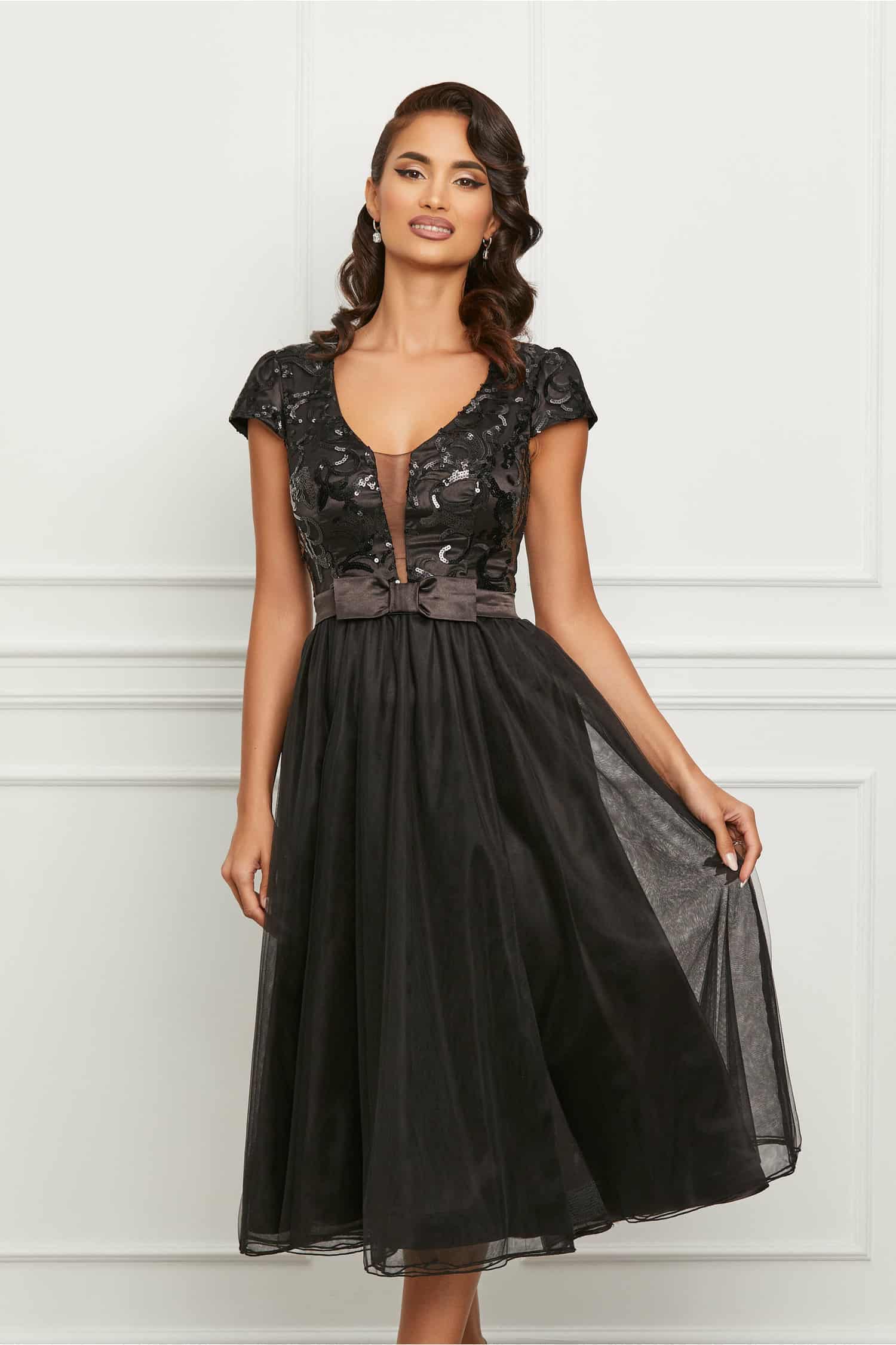 Rochie MBG neagra cu broderie la bust si funda in talie