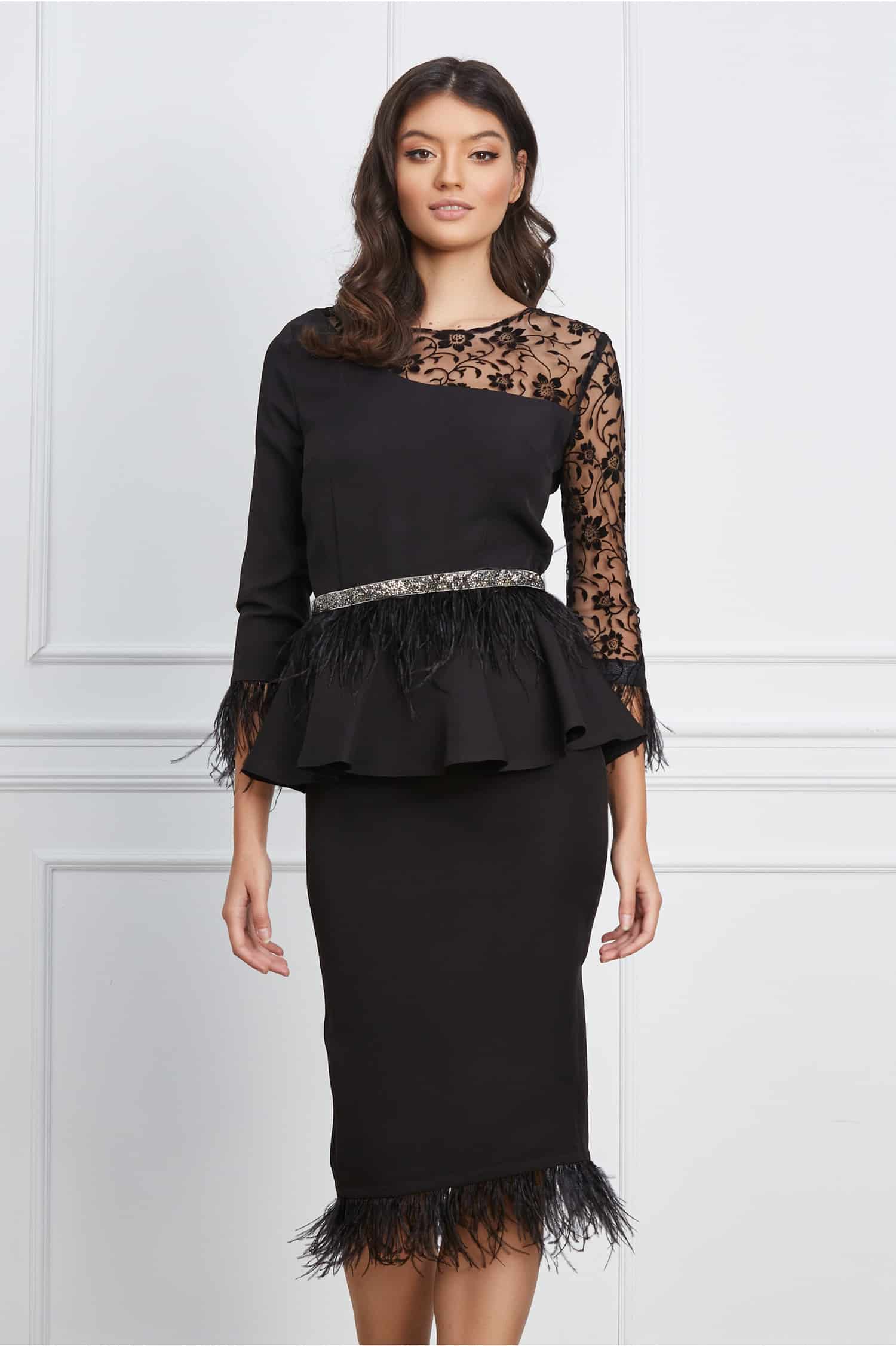 Rochie eleganta accesorizata cu dantela si paiete pe bust si maneci, iar in talie si la baza prezinta pene decorative. Are decolteu rotund, maneci trei sferturi si croi cambrat cu peplum in talie. Rochie eleganta Decolteu rotund Maneci trei sferturi Croi conic Peplum in talie Fara captuseala Se inchide cu fermaor la spate Material: Stofa Compozitie: 95% Poliester, 5% Elastan Instructiuni de intretinere: *Va rugam verificati eticheta produsului inainte de curatare! *Modelul are inaltimea de 174 cm. *Va rugam sa retineti ca o usoara discrepanta de culoare ar trebui sa fie acceptabila datorita luminii si luminozitatii ecranului. *Va rugam verificati ghidul de marimi, in cm, pentru a alege corect marimea.