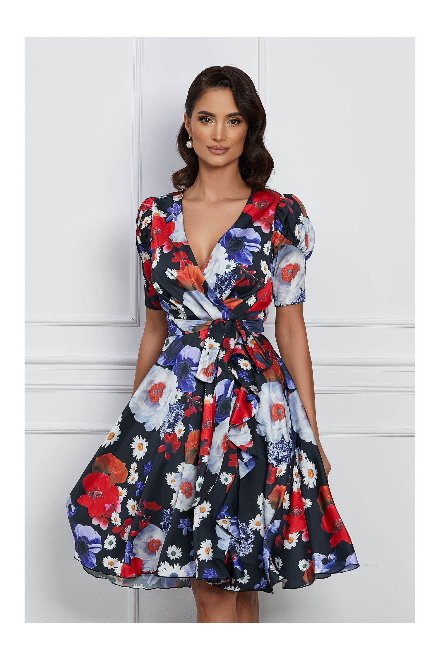 Specification: Rochie MBG neagra cu imprimeu floral si cordon in talie