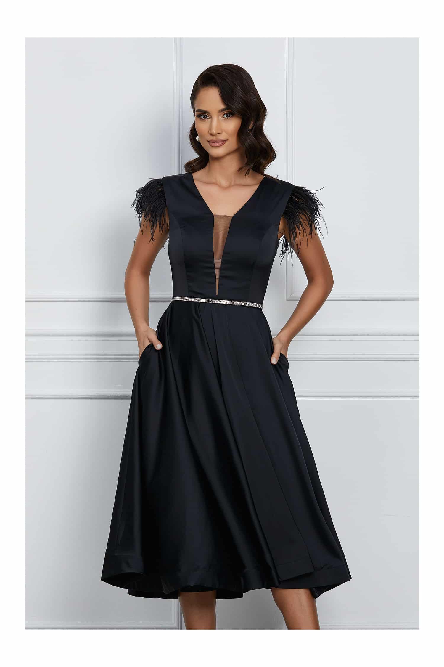 Rochie MBG neagra din satin cu pene la maneci ! Transport si retur gratuite indifernet de valoarea comenzii!