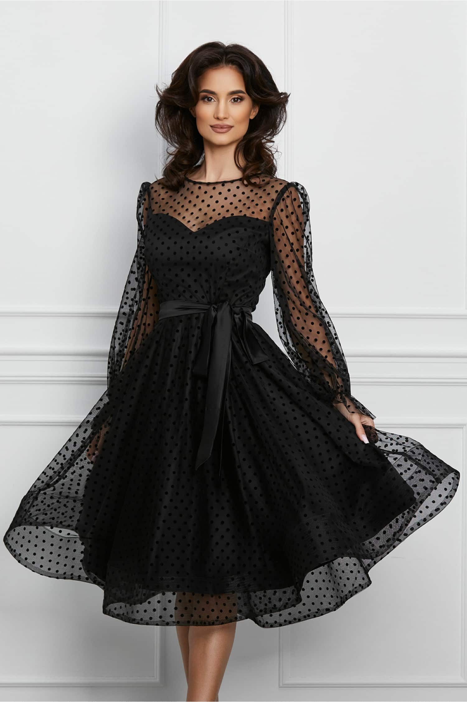 Specification: Rochie MBG neagra din tull cu buline si cordon satinat in talie