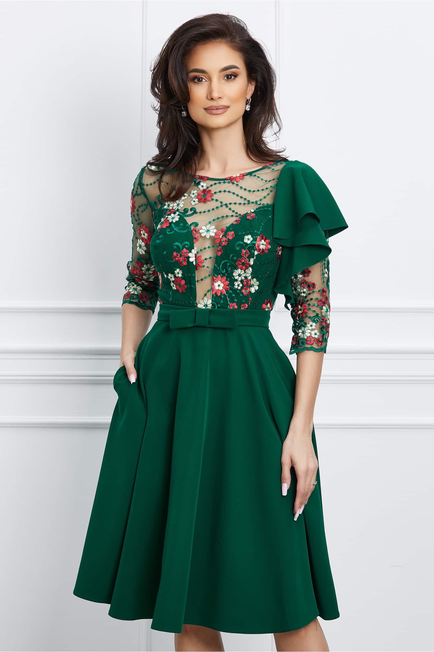 Specification: Rochie MBG verde cu dantela florala la bust si volan pe umar