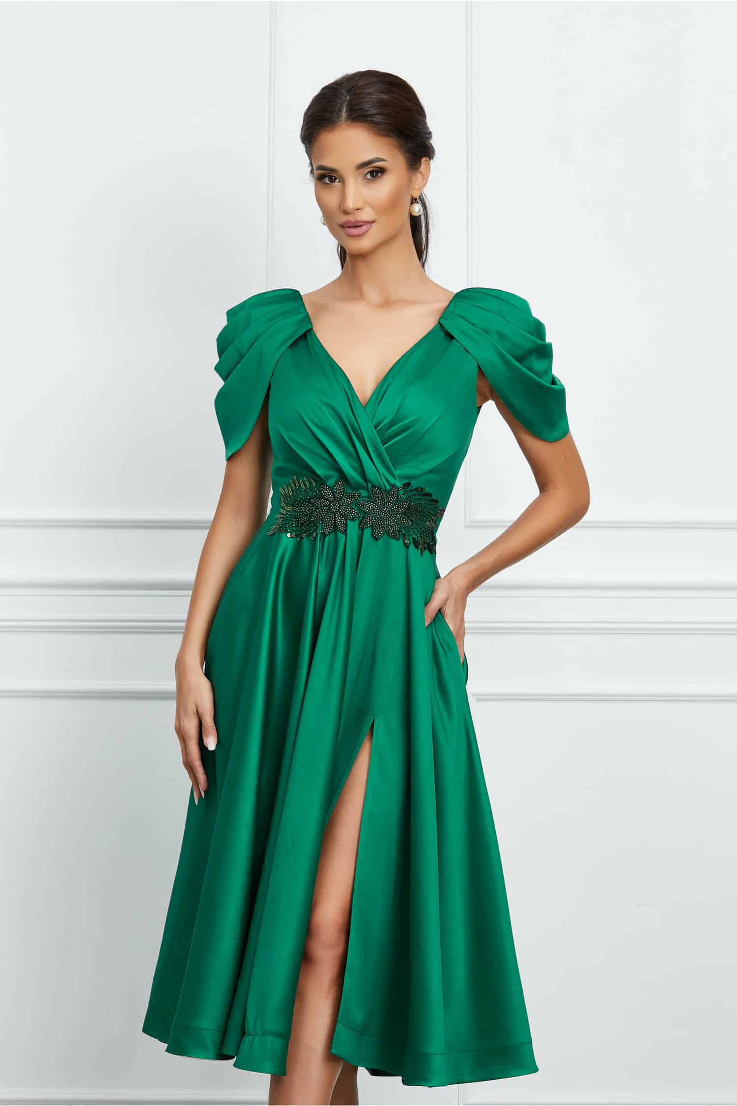 Be the first to review “Rochie MBG verde cu umeri bufanti si broderie in talie”