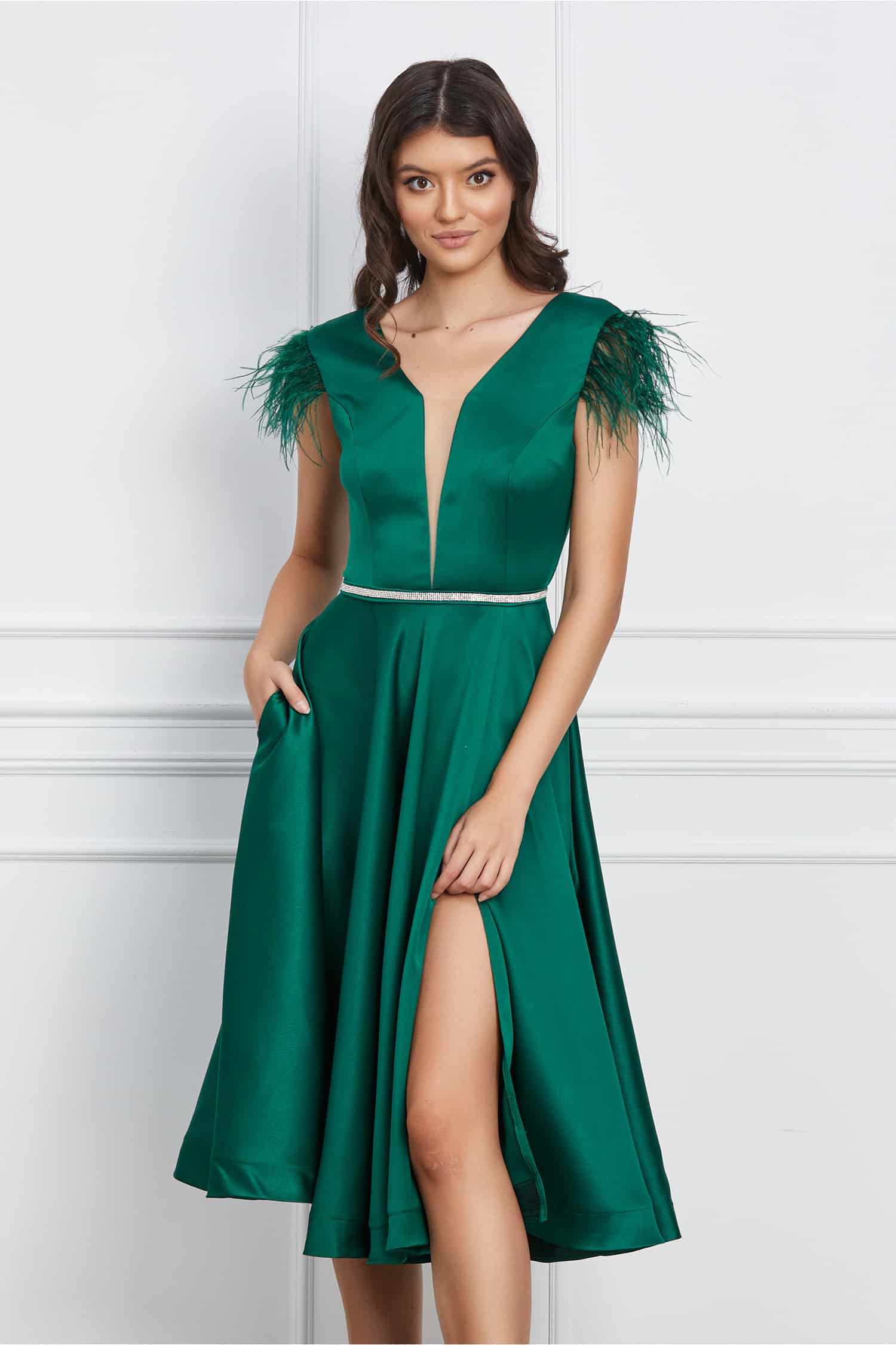 Specification: Rochie MBG verde din satin cu pene la maneci