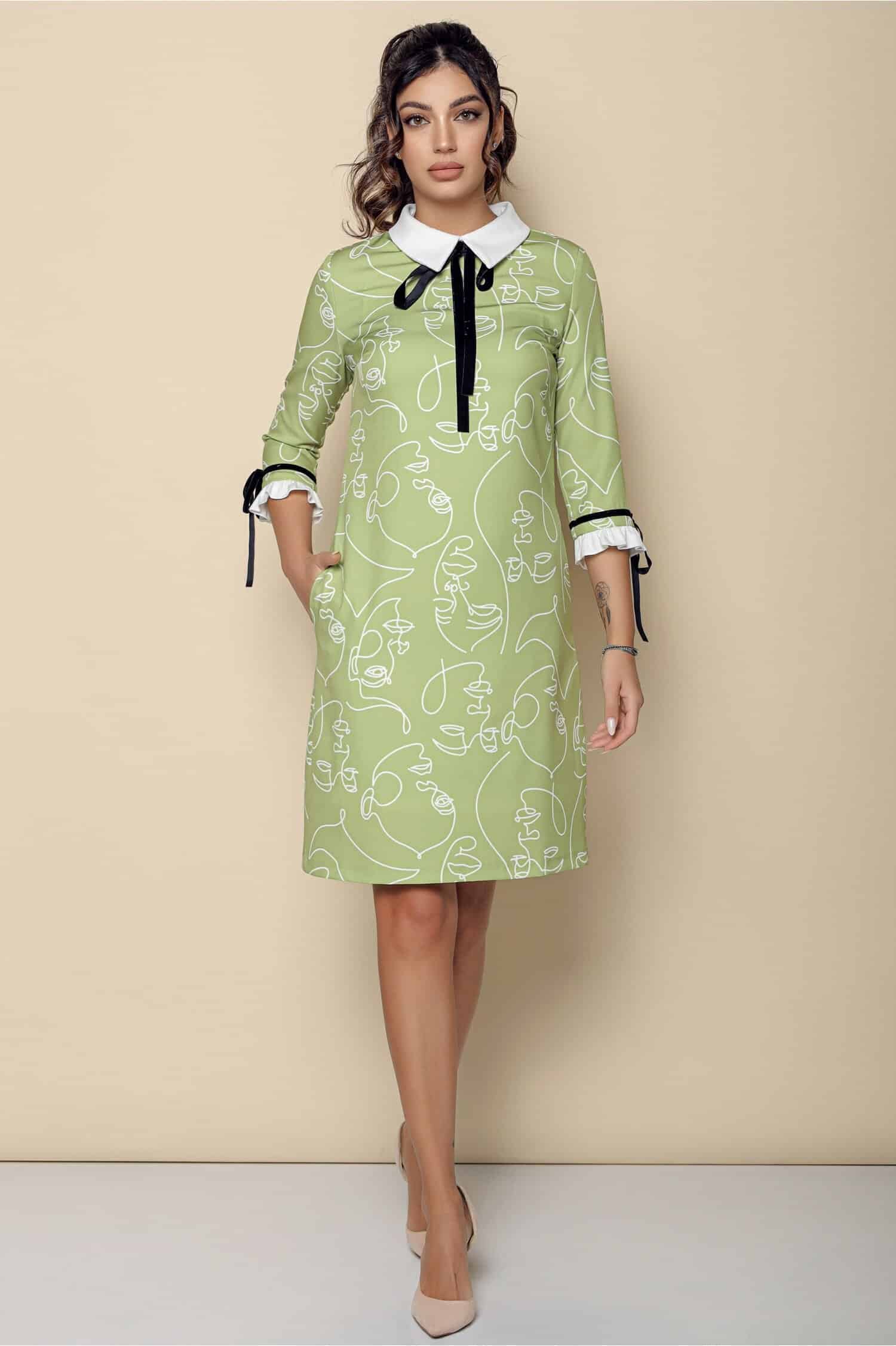Rochie MBG verde fistic cu imprimeuri si guler alb ! Transport si retur gratuite indifernet de valoarea comenzii!