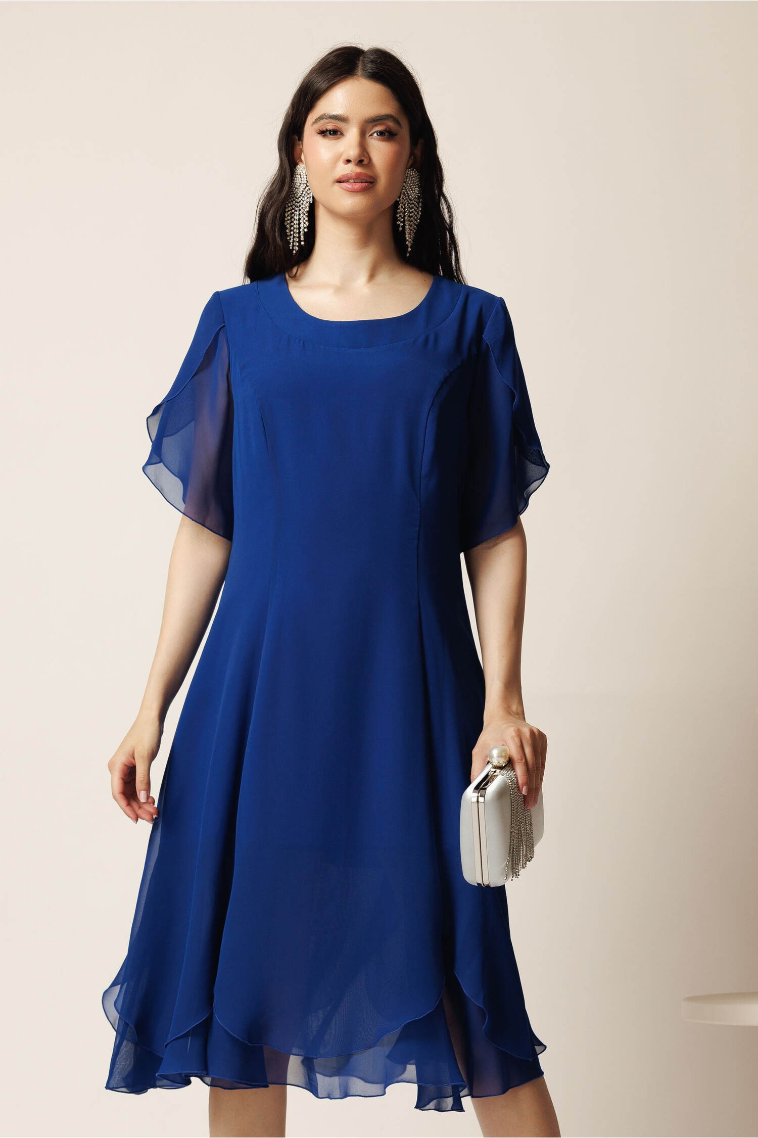Rochie midi albastra din voal in clin cu volane la baza