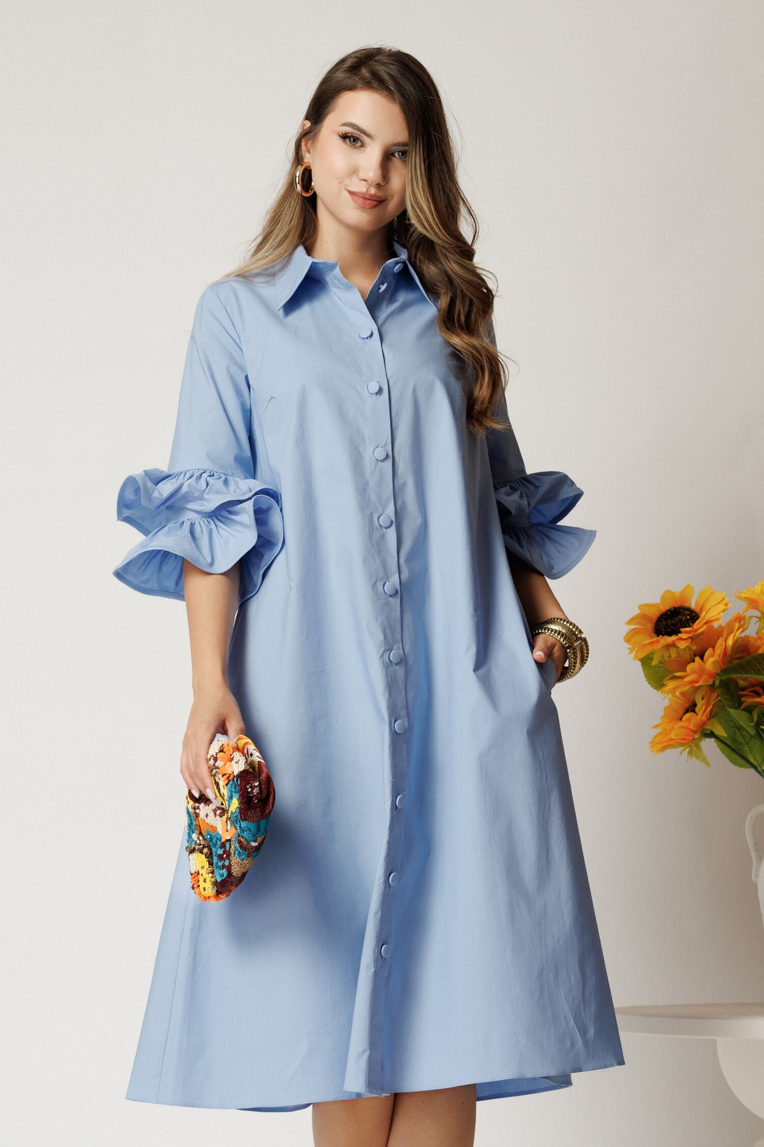Specification: Rochie midi bleu din bumbac tip camasa cu croi A