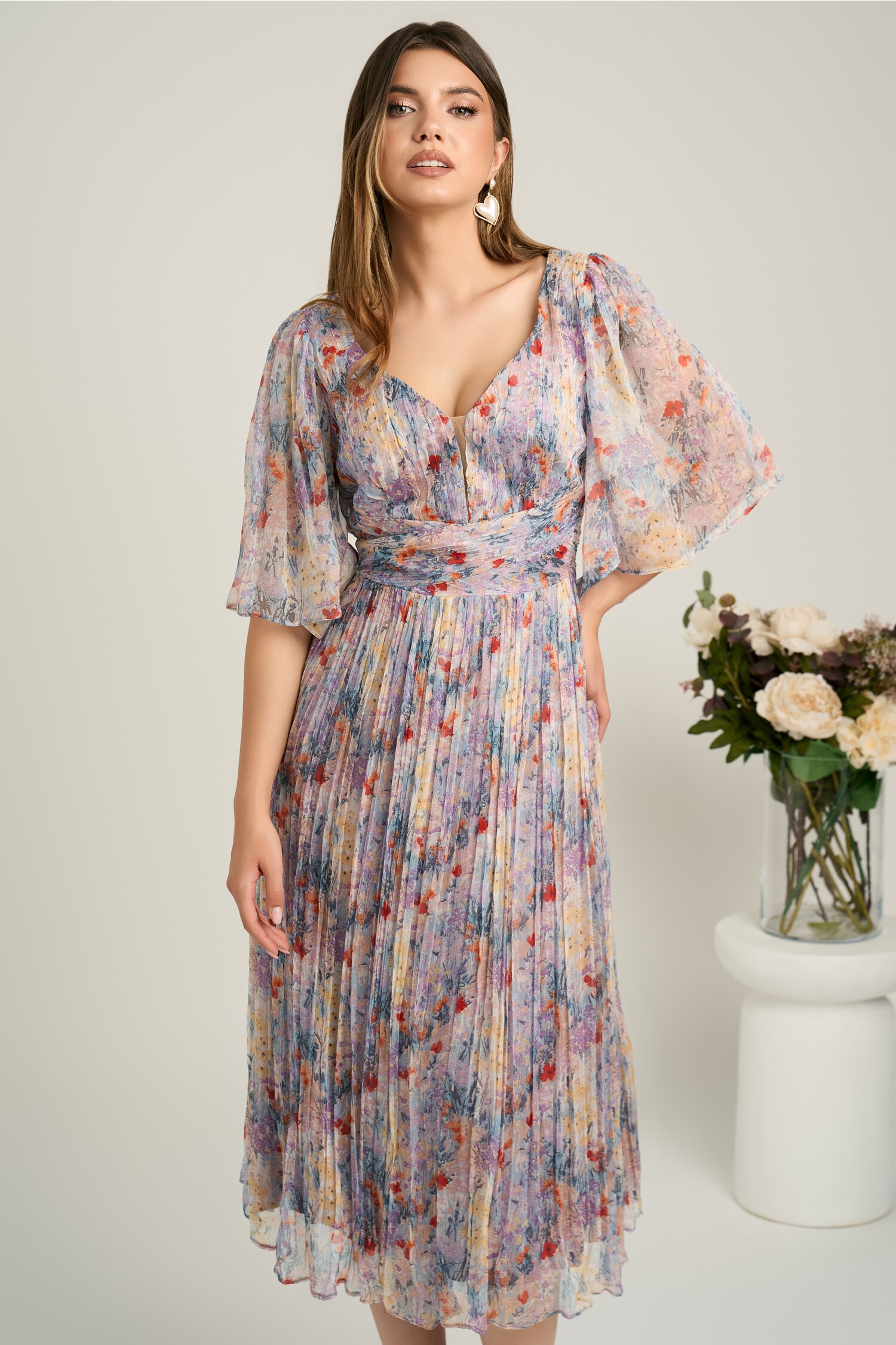 Rochie midi bleu din matase naturala cu imprimeuri florale lila- Viada