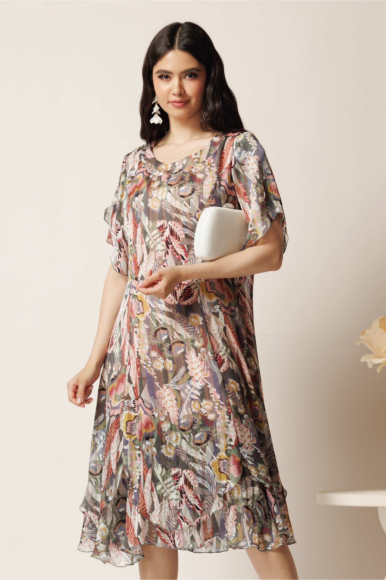 Rochie midi gri din voal in clin cu imprimeu floral roz si volane la baza
