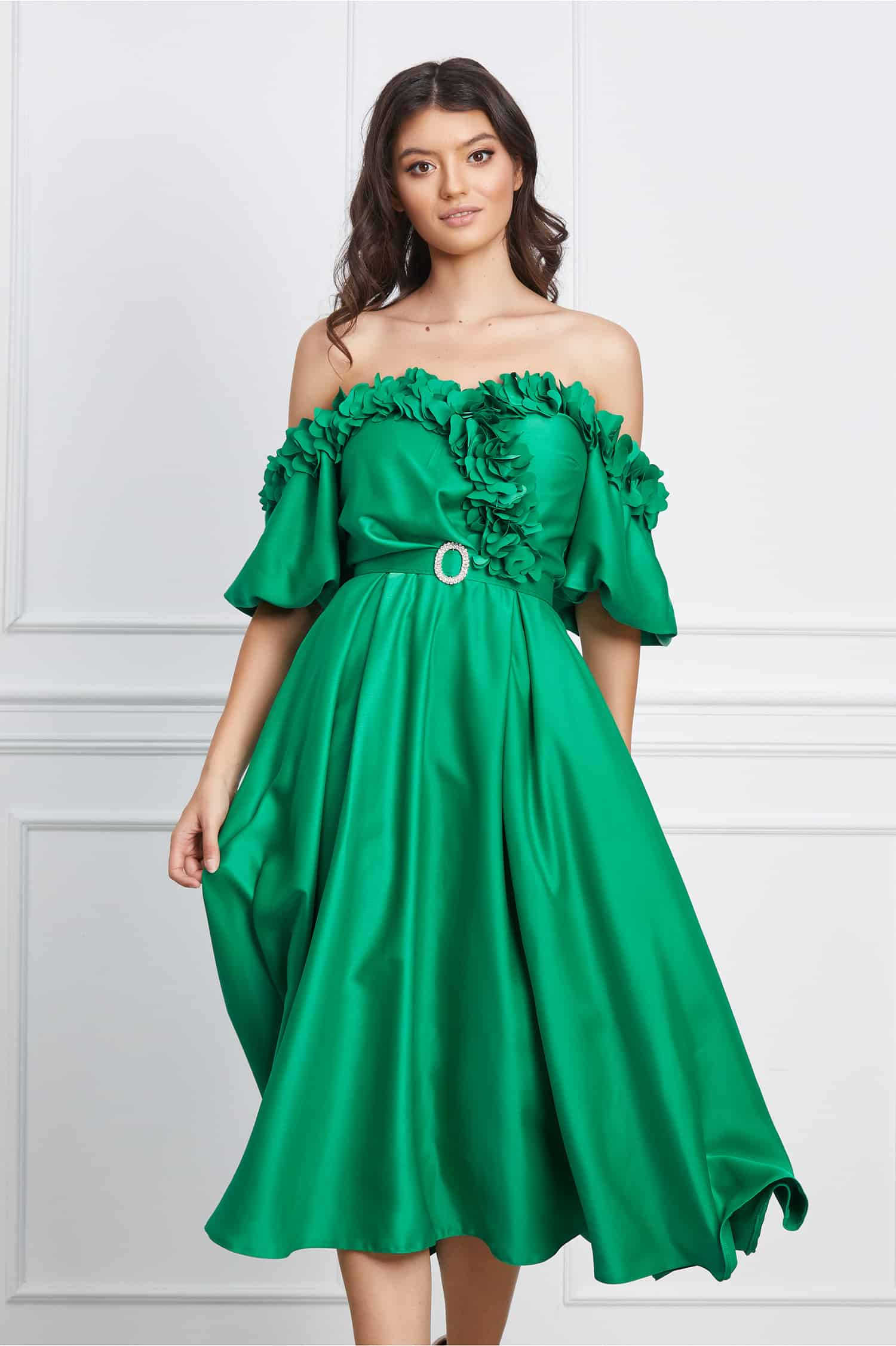 Specification: Rochie Mikaela verde cu flori 3D la bust si curea in talie
