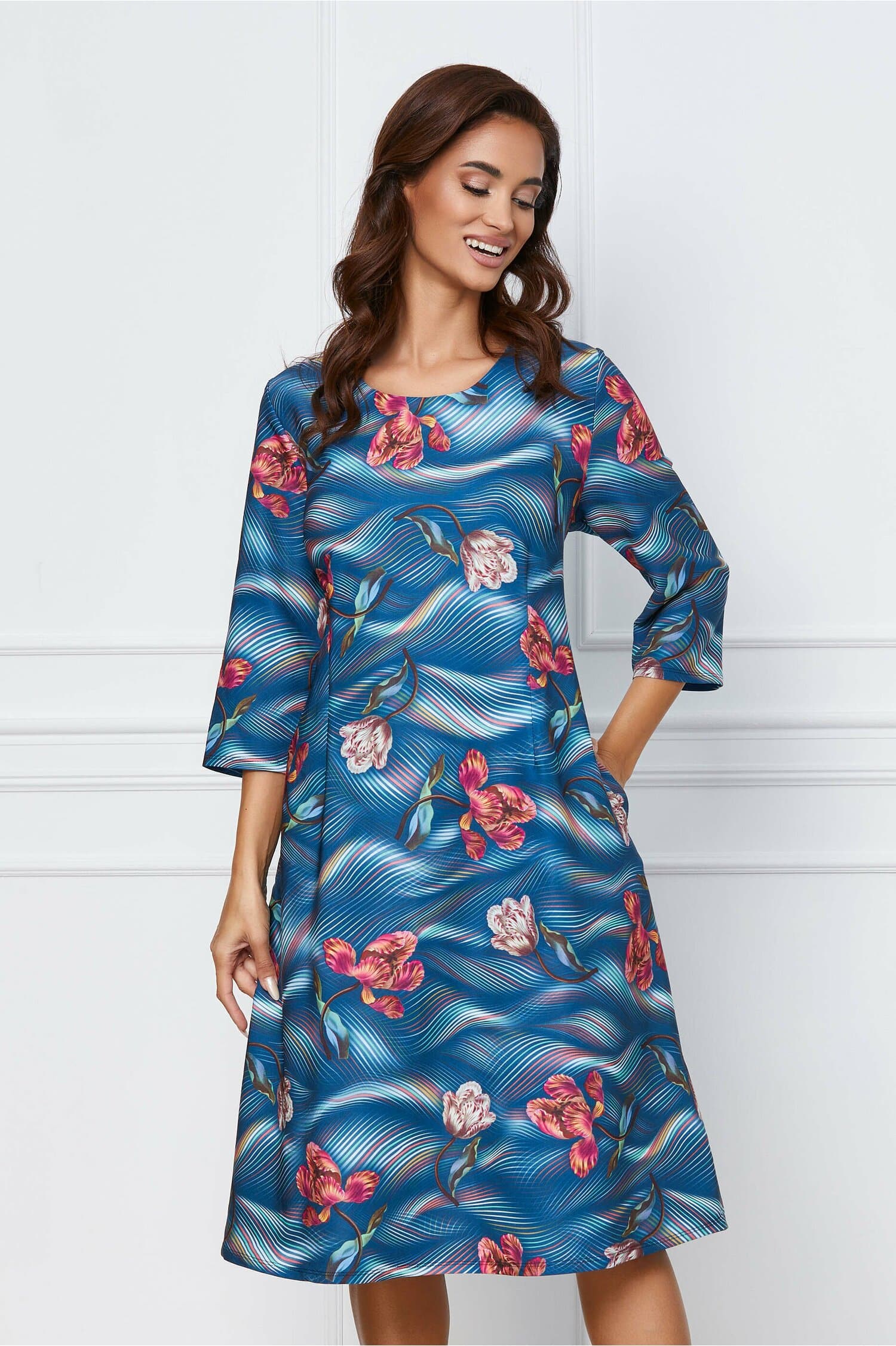 Rochie de zi cu imprimeu. Are decolteu rotund, maneci trei sferturi, croi tip A si buzunare functionale. Rochie de zi Decolteu rotund Maneci trei sferturi Croi tip A Buzunare functionale Fara captuseala Inchidere cu fermoar la spate Material: Stofa Compozitie: 95% Poliester, 5% Elastan Instructiuni de intretinere:     *Va rugam verificati eticheta produsului inainte de curatare! *Pozitia tiparului imprimeului poate fi diferita datorita taierii. *Modelul are inaltimea de 174 cm. *Va rugam sa retineti ca o usoara discrepanta de culoare ar trebui sa fie acceptabila datorita luminii si luminozitatii ecranului.  *Va rugam verificati ghidul de marimi, in cm, pentru a alege corect marimea. Â