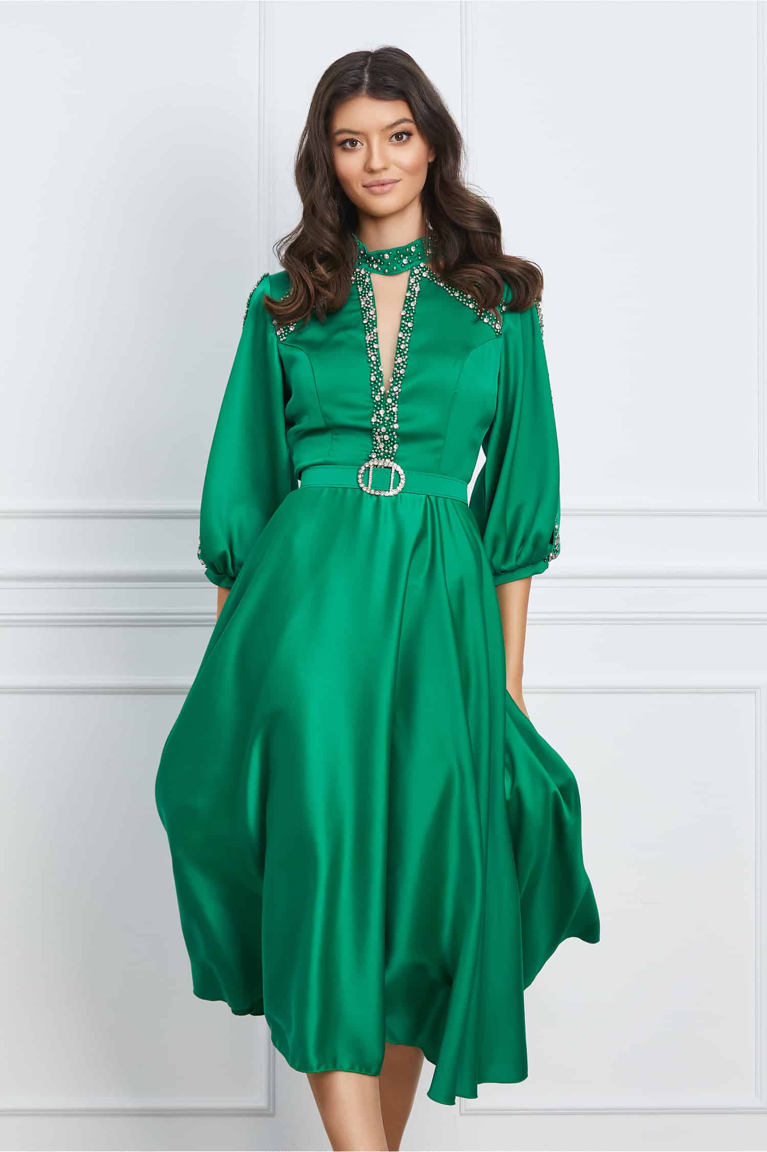 Rochie eleganata accesorizata cu strasuri la bust si curea detasabila in talie. Are guler la baza gatului, maneci trei sferturi bufante cu decupaj si croi clos. Rochie eleganta Guler la baza gatului Cupe la bust Maneci trei sferturi Croi clos Captusita pe interior Se inchide cu fermoar la spate Material: Satin Compozitie: 95% Poliester, 5% Elastan Instructiuni de intretinere: *Va rugam verificati eticheta produsului inainte de curatare! *Modelul are inaltimea de 174 cm. *Va rugam sa retineti ca o usoara discrepanta de culoare ar trebui sa fie acceptabila datorita luminii si luminozitatii ecranului. *Va rugam verificati ghidul de marimi, in cm, pentru a alege corect marimea.