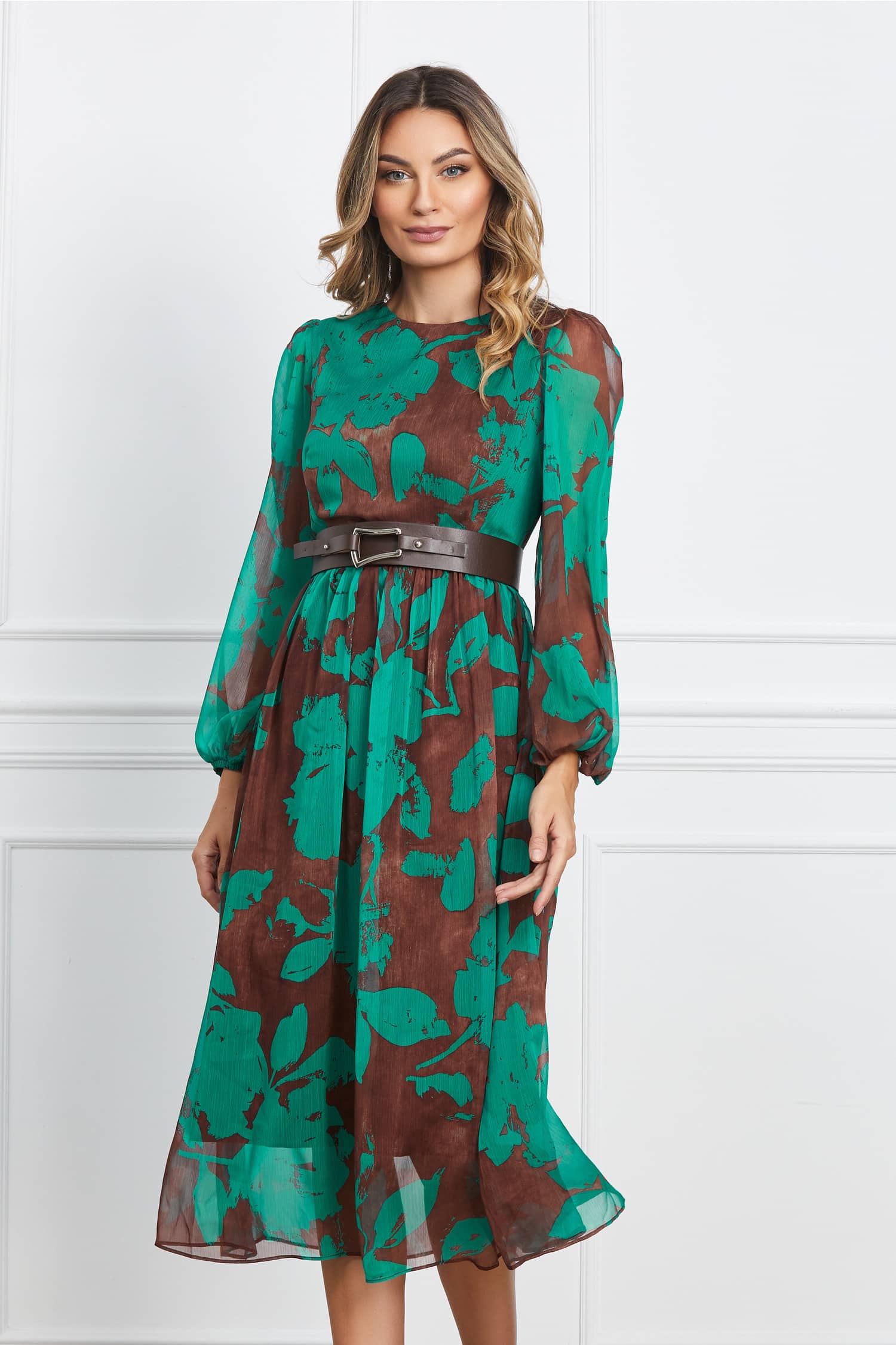 Specification: Rochie Miranda maro cu imprimeuri verzi si curea in talie