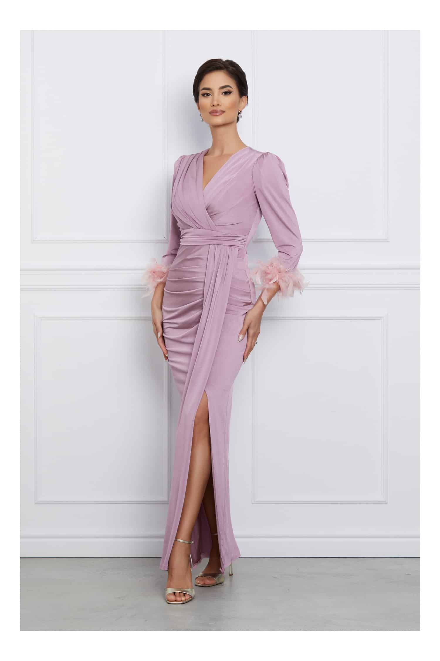 Specification: Rochie Mirela roz satinata cu pliuri si pene la baza manecilor
