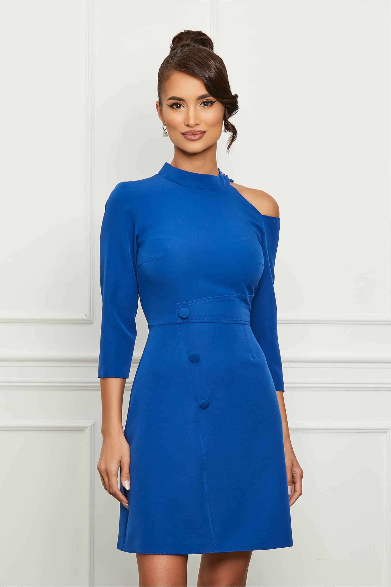 Rochie Moze albastra cu un umar gol si nasturi pe fusta ! Transport si retur gratuite indifernet de valoarea comenzii!