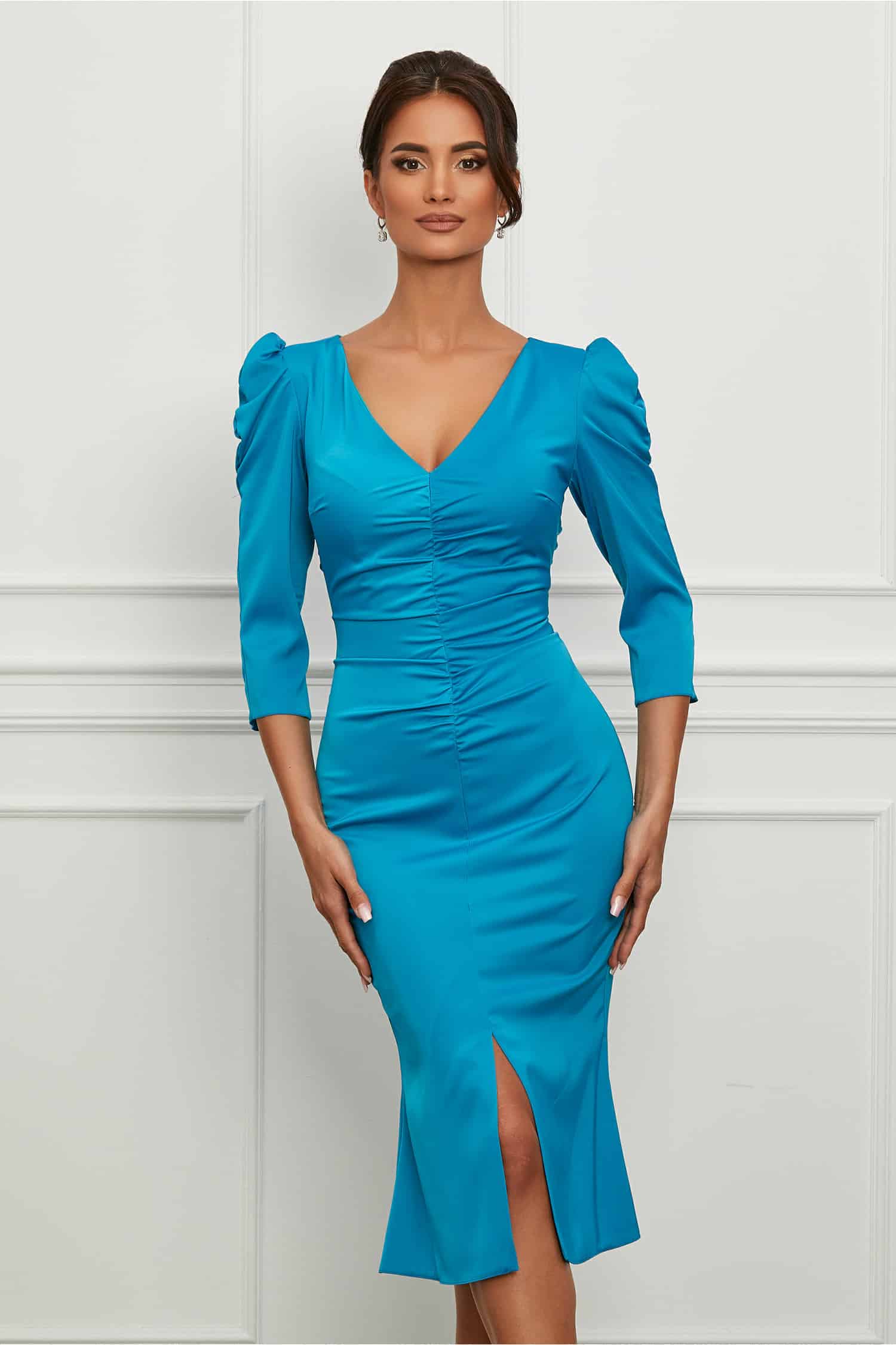 Specification: Rochie Moze albastru cu fronseuri si crepeu frontal