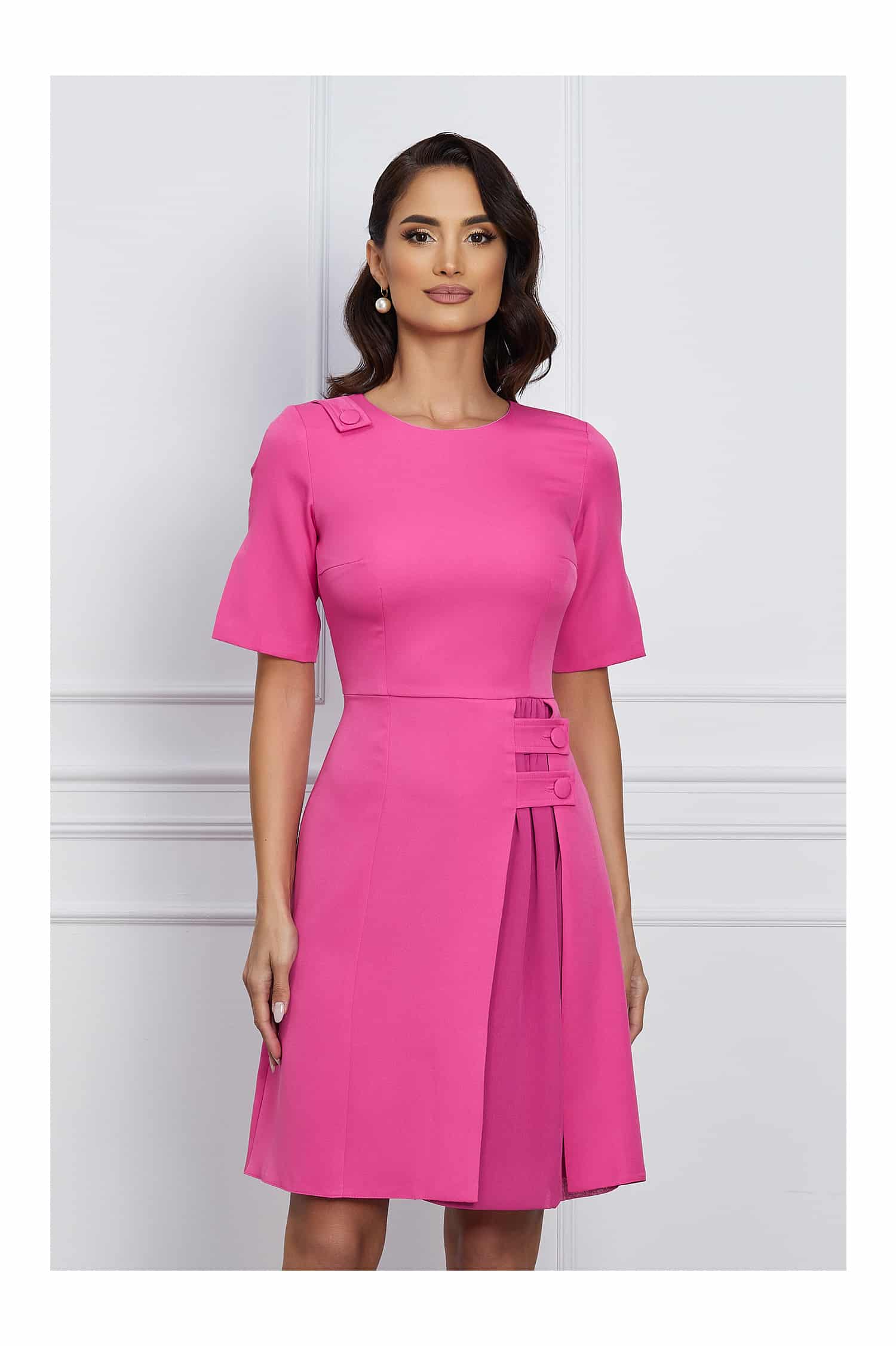 Specification: Rochie Moze fucsia cu nasturi pe fusta si insertie in voal