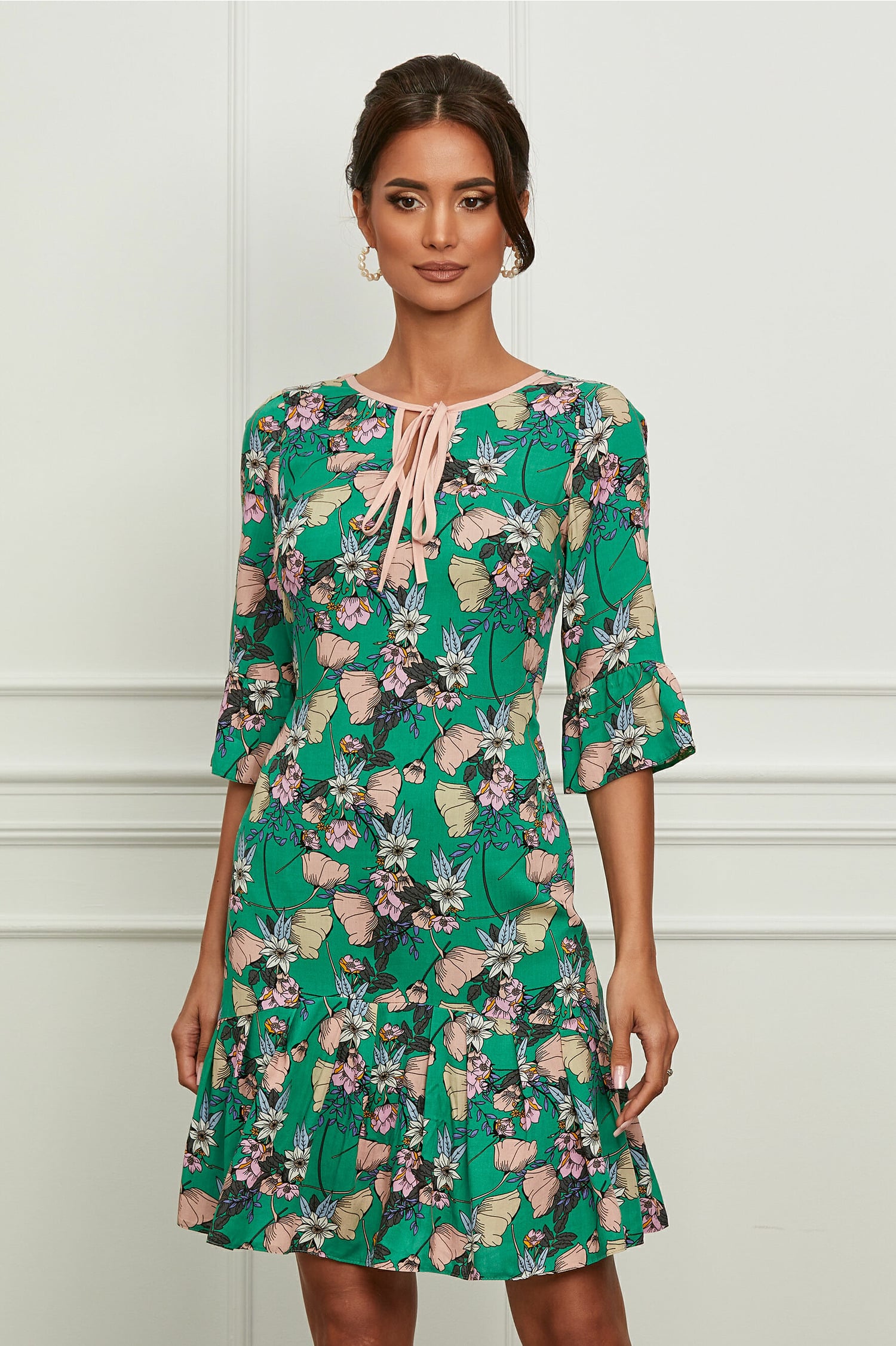 Specification: Rochie Moze verde cu flori roz