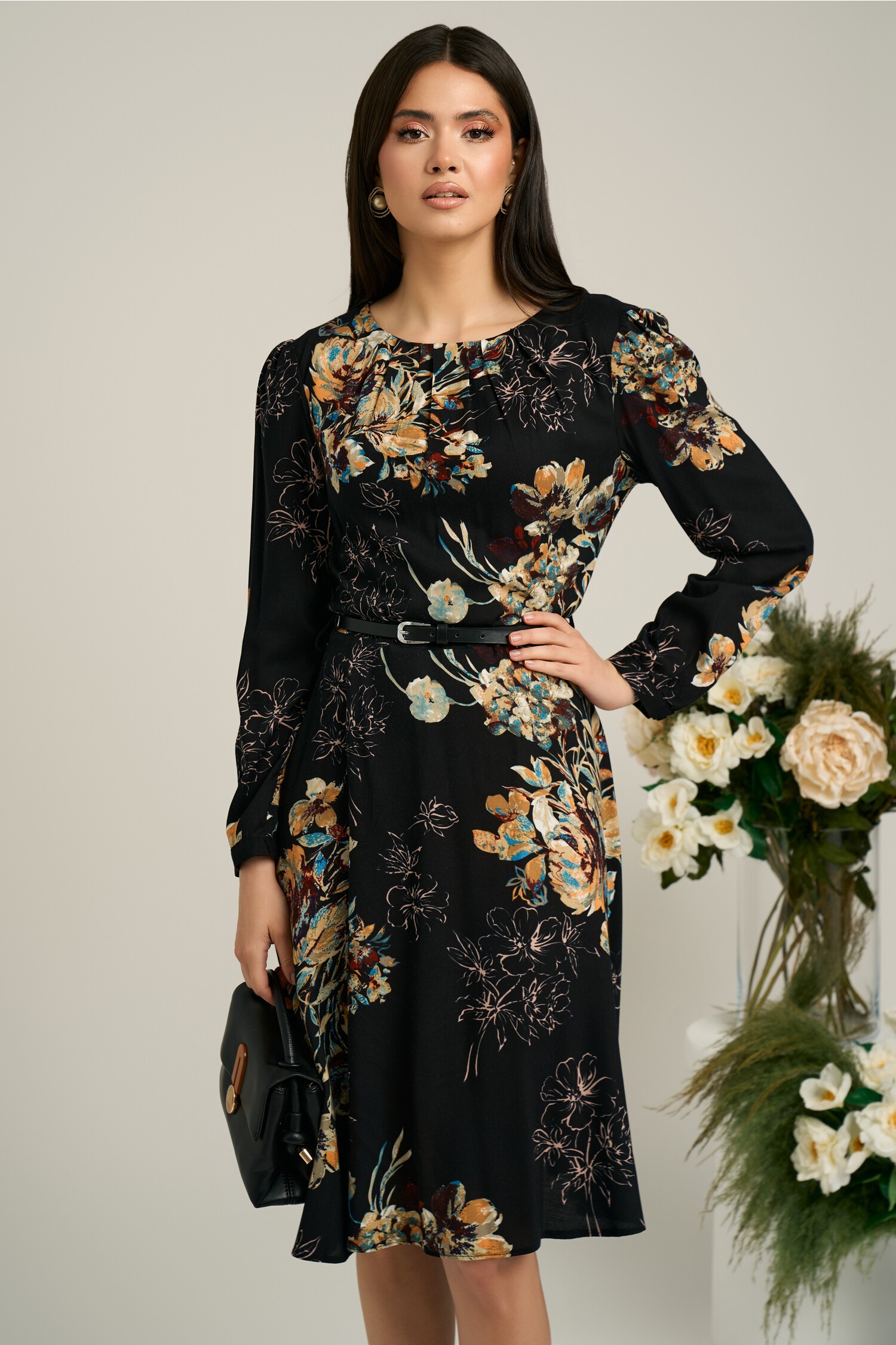 Specification: Rochie neagra cu imprimeuri florale bej si curea in talie