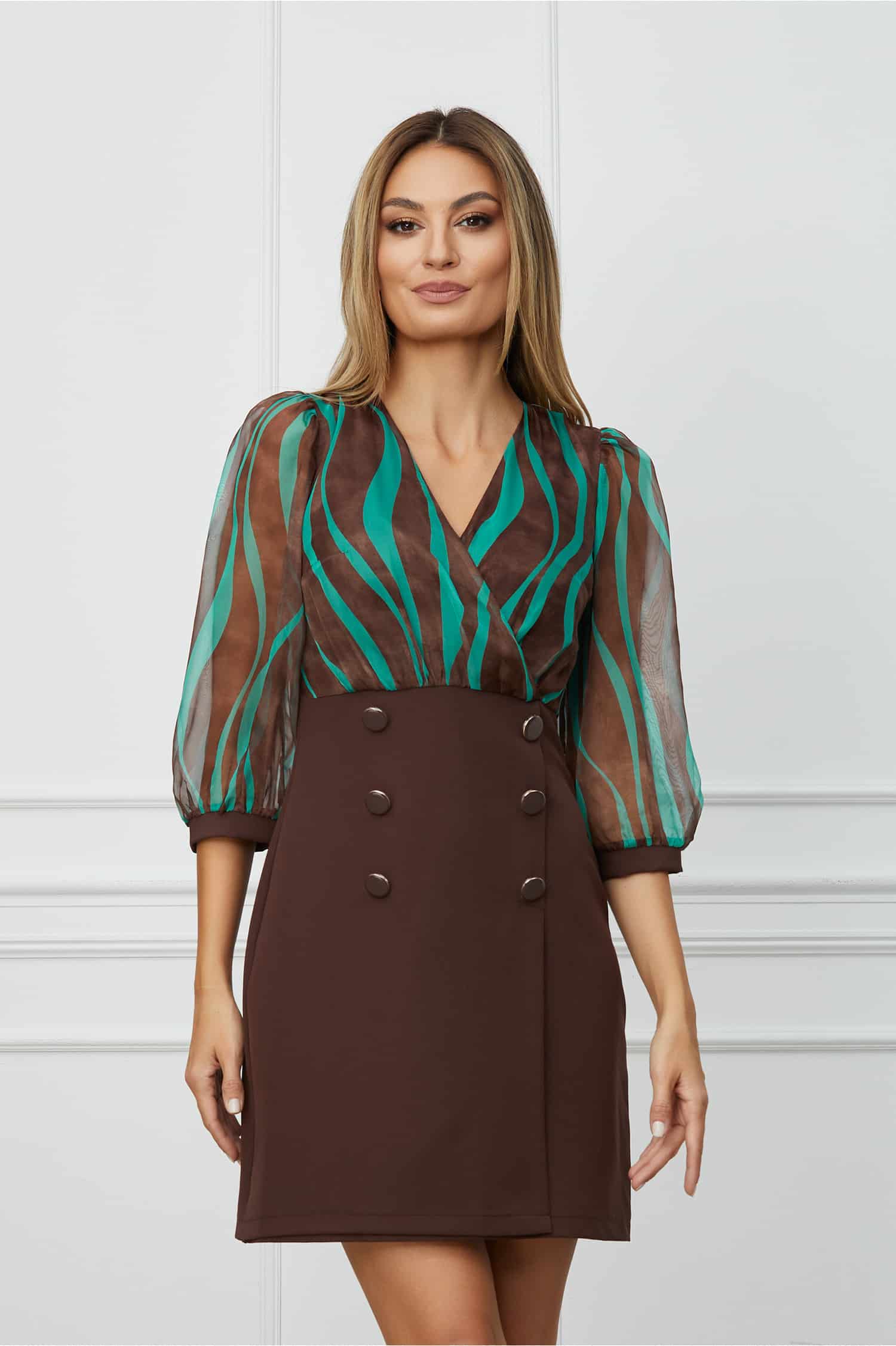 Specification: Rochie Oana maro cu imprimeu turcoaz la bust si nasturi pe fusta