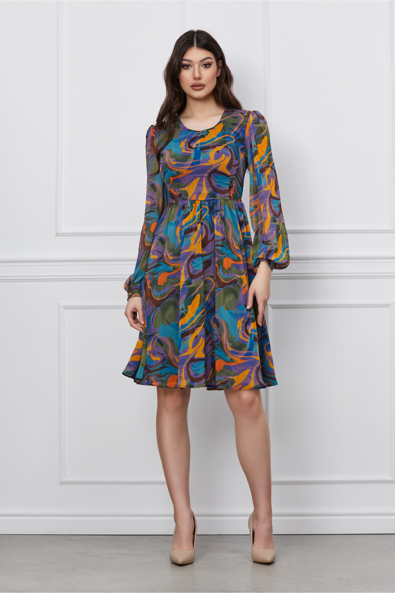 Rochie vaporoasa cu imprimeu. Are decolteu rotund la baza gatului, maneci lungi si croi clos. Se inchide cu fermoar la spate. Rochie de zi Imprimeu Decolteu la baza gatului Maneci lungi Croi clos Captusita pe interior Inchidere cu fermoar la spate Material: Voal Compozitie: 95% poliester, 5% elastan *Va rugam verificati eticheta produsului inainte de curatare! *Pozitia tiparului imprimeului poate fi diferita datorita taierii. *Modelul are inaltimea de 179 cm. *Va rugam sa retineti ca o usoara discrepanta de culoare ar trebui sa fie acceptabila datorita luminii si luminozitatii ecranului. *Va rugam verificati ghidul de marimi, in cm, pentru a alege corect marimea.