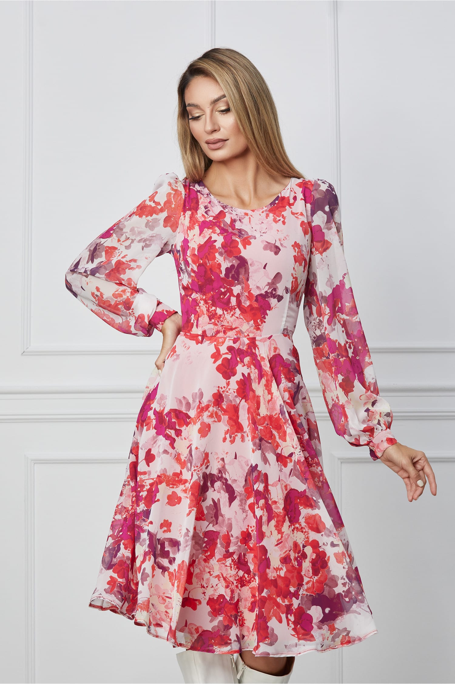 Rochie vaporoasa cu imprimeu. Are decolteu rotund la baza gatului, maneci lungi si croi clos. Se inchide cu fermoar la spate.  Rochie de zi Imprimeu Decolteu la baza gatului Maneci lungi Croi clos Captusita pe interior Inchidere cu fermoar la spate Material: Voal  Compozitie: 95% poliester, 5% elastan Instructiuni de intretinere:     *Va rugam verificati eticheta produsului inainte de curatare! *Pozitia tiparului imprimeului poate fi diferita datorita taierii. *Modelul are inaltimea de 174 cm. *Va rugam sa retineti ca o usoara discrepanta de culoare ar trebui sa fie acceptabila datorita luminii si luminozitatii ecranului.  *Va rugam verificati ghidul de marimi, in cm, pentru a alege corect marimea.