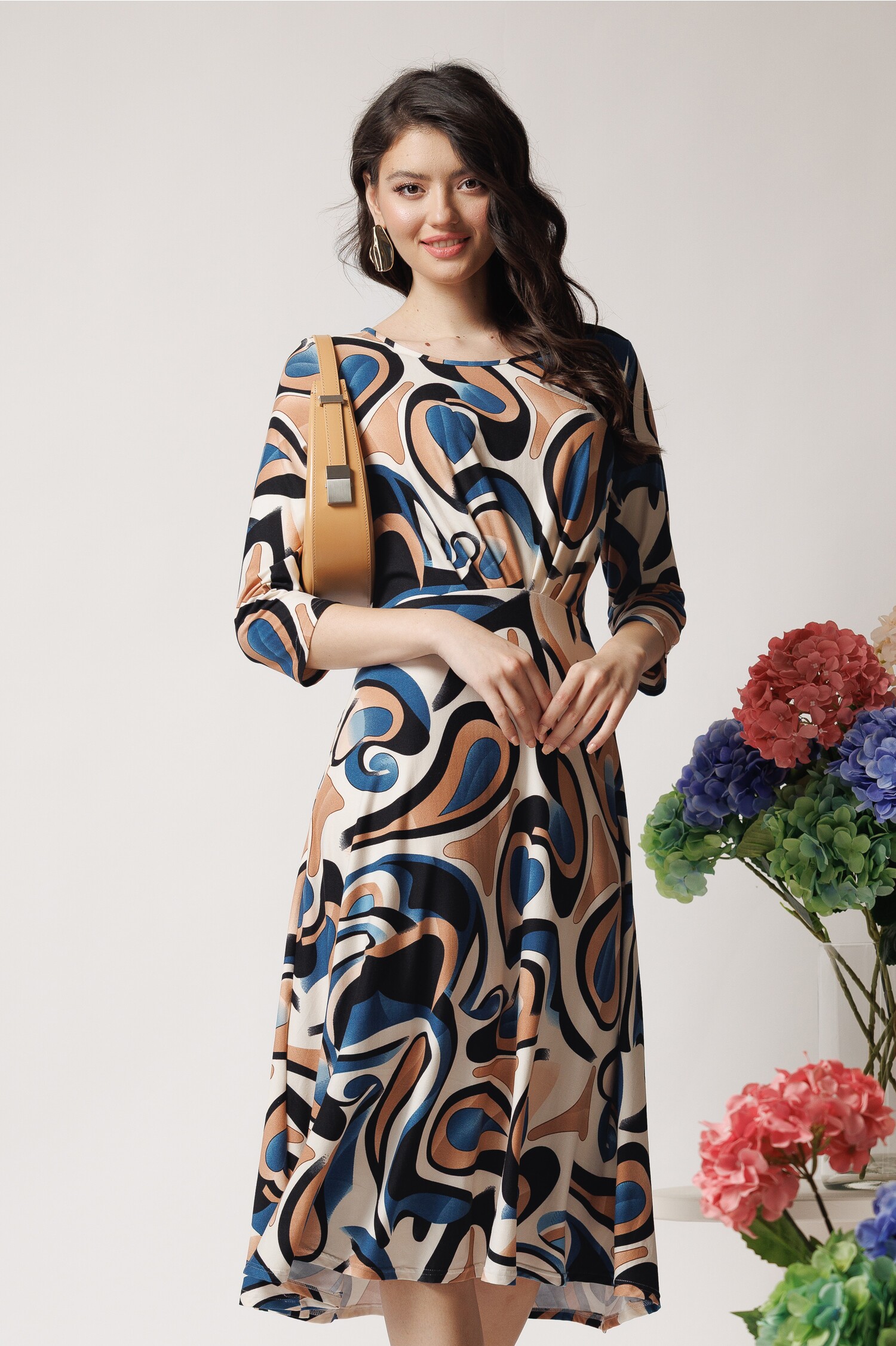 Rochie office din viscoza bej cu imprimeuri albastre