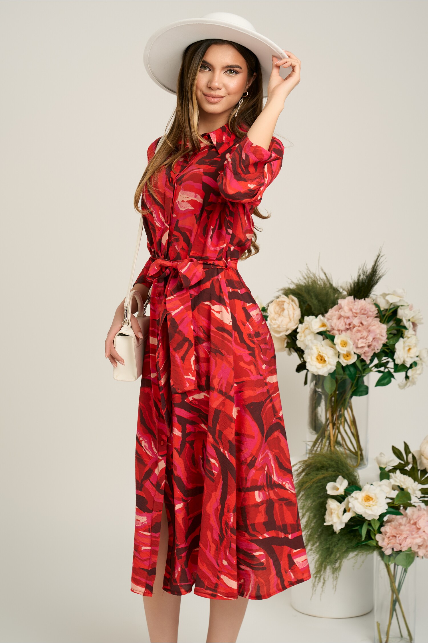 Specification: Rochie office din viscoza corai cu imprimeu si cordon in talie