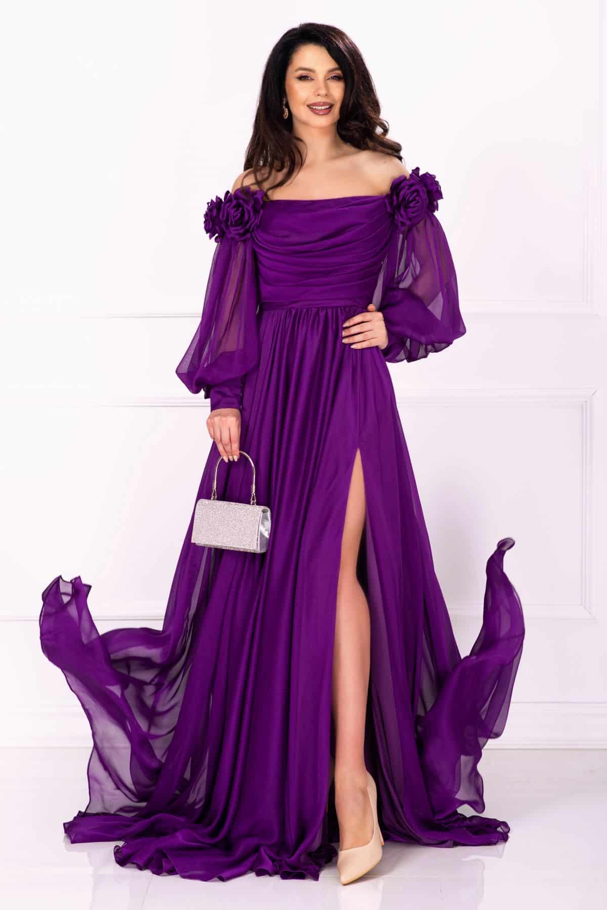 Specification: Rochie pretioasa de nasa Mireya mov lunga cu fronseuri si flori 3D