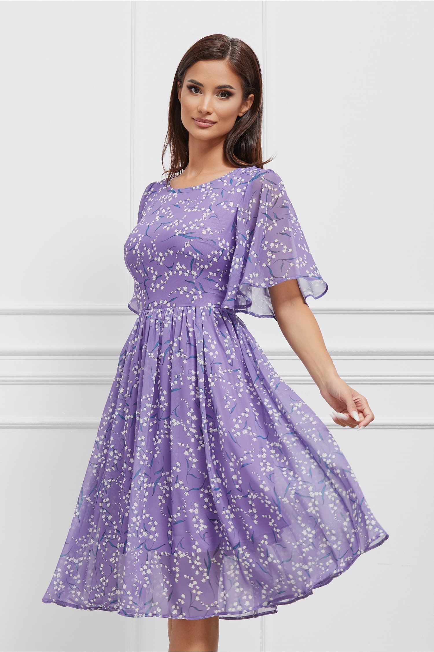 Specification: Rochie Raluca mov cu imprimeu floral si maneci largi