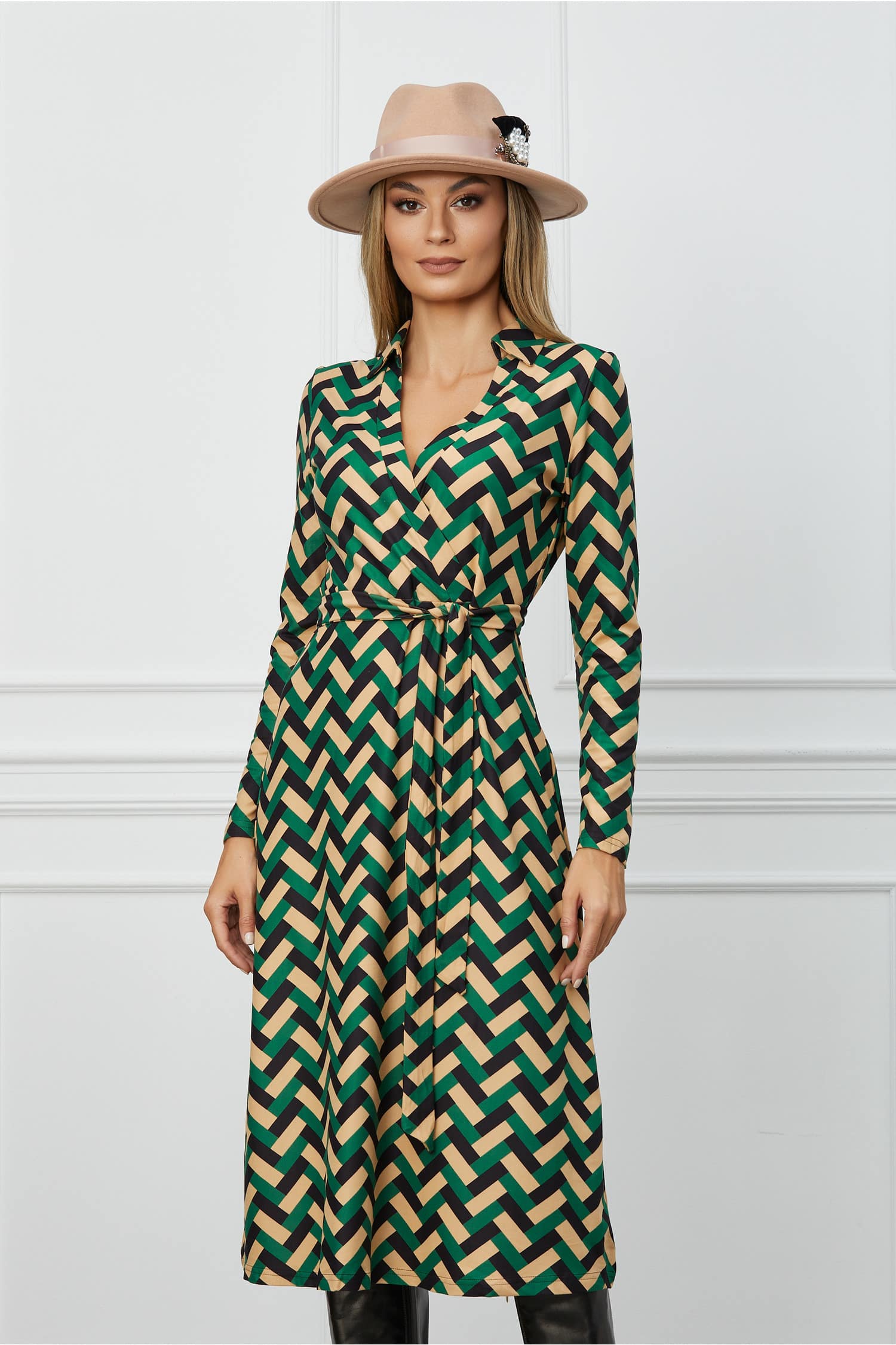Rochie Ramona bej cu imprimeuri verzi si cordon in talie